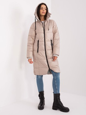 Hurtownia Beżowa długa kurtka zimowa z kapturem
