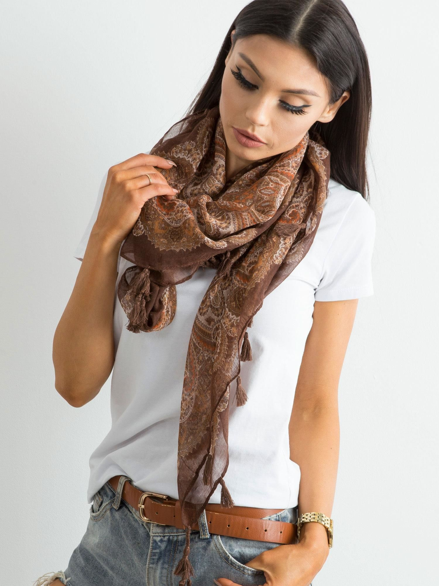 Brązowa chusta z nadrukiem i frędzelkami.