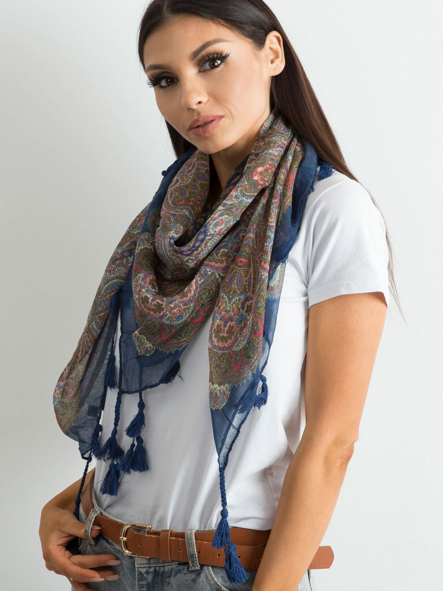 Ciemnoniebieska chusta z nadrukiem i frędzelkami.