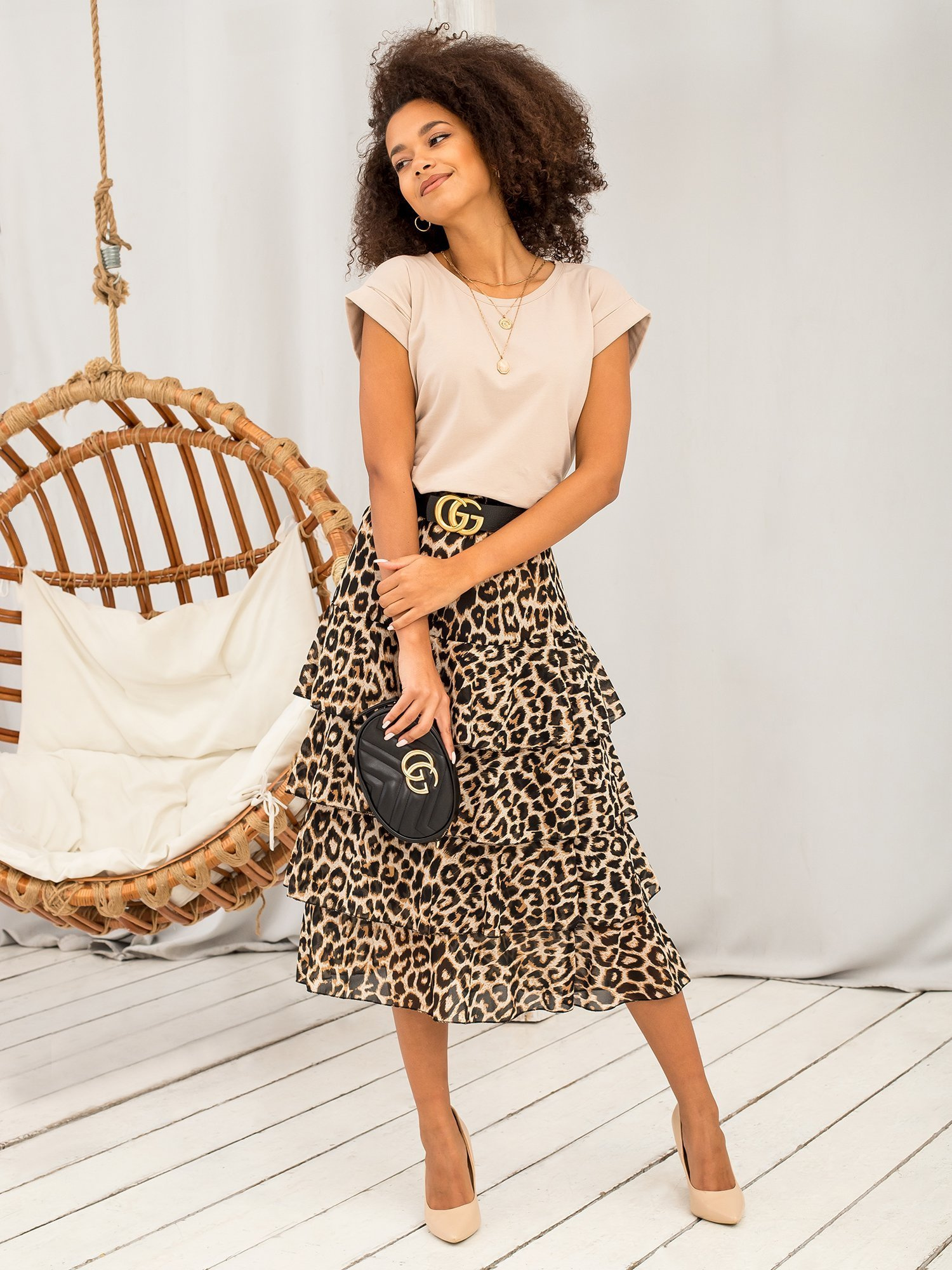 Modelka ma na sobie rozmiar S. Wymiary modelki: wzrost 176 cm, biust 85 cm, talia 64 cm, biodra 92 cm.