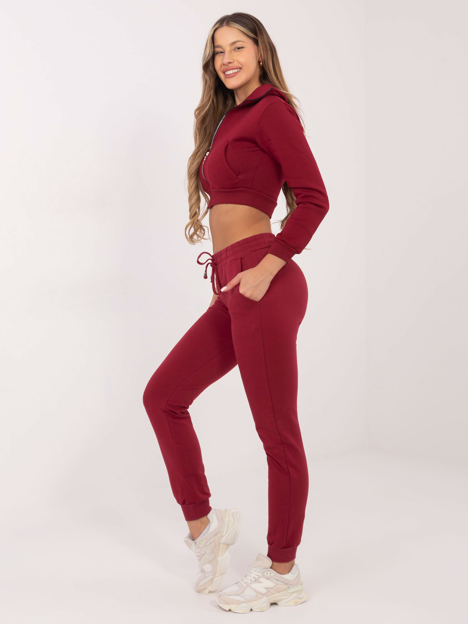 Bordowe spodnie Faster Bawełniane spodnie dresowe to ważna część garderoby dla wielu miłośniczek sportowego stylu. Sprawdzają się świetnie zarówno na treningu, jak i do miejskich stylizacji na co dzień. Damskie dresy są też super wygodnym pomysłem podczas home office, gdy nie musisz nigdzie wychodzić. Ten model ma najmodniejszy fason slim fit z wąskimi nogawkami zwieńczonymi miękkimi ściągaczami, dlatego świetnie układają się na sylwetce i są bardzo wygodne w noszeniu. Uszyto je z wysokiej jakości materiałów, które są jednocześnie przewiewne i przyjemne w dotyku, co znacząco wpływa na komfort noszenia. Spodnie mają dodatkowo troczki oraz elastyczną gumkę w pasie, co pozwala jeszcze lepiej dopasować je do swojej sylwetki. Zakładaj je do modnych sneakersów i t-shirtów albo do botków i eleganckich bluzek z naszego sklepu.