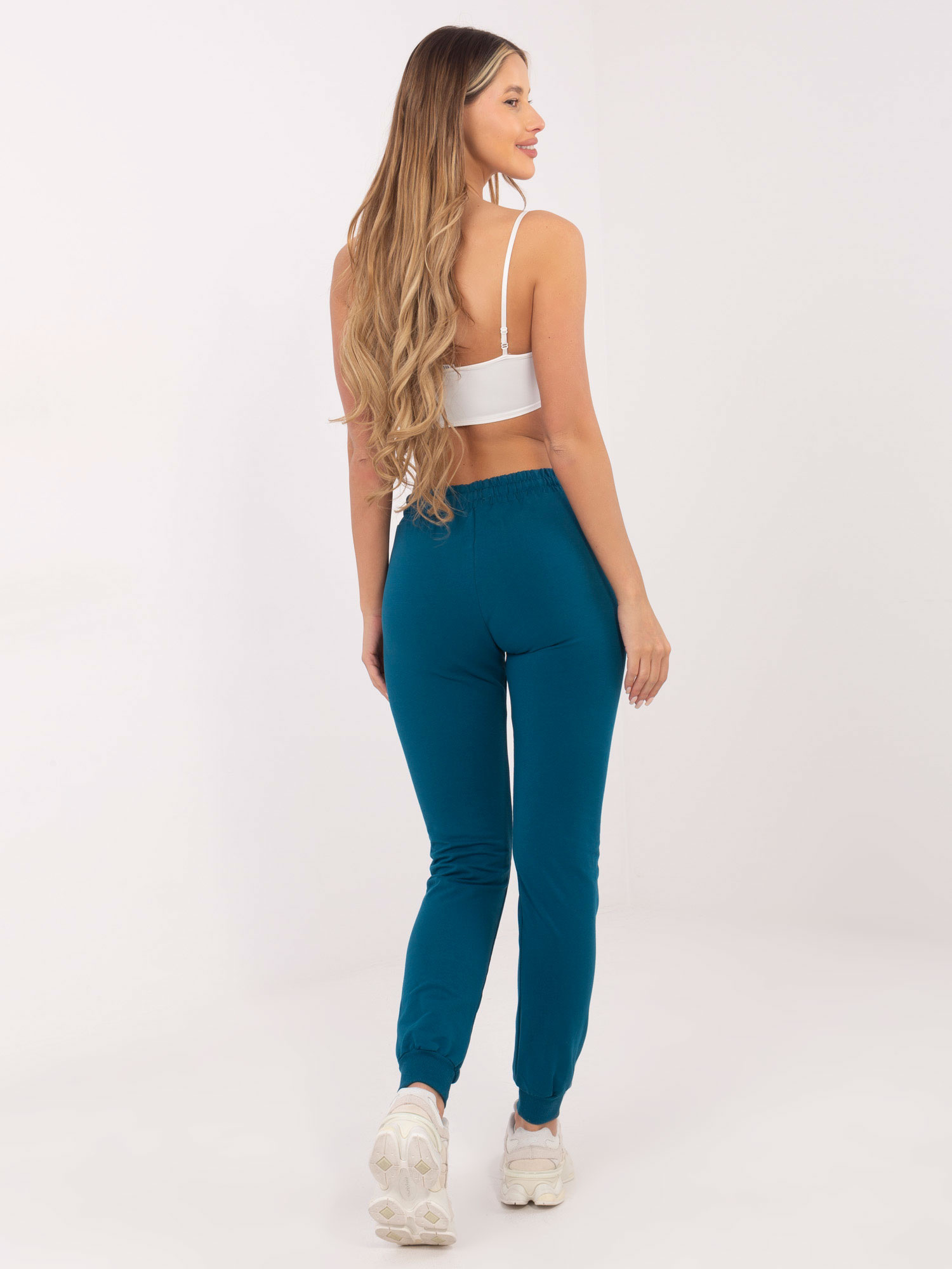 Morskie spodnie Faster Gładkie spodnie dresowe to prawdziwy must have w szafie każdej kobiety ceniącej najnowsze trendy oraz sportowy styl. Najlepsze są takie, które łączą w sobie wygodę i kobiecy fason, ponieważ mogą posłużyć do stworzenia niezliczonej liczby stylizacji. Prezentowane spodnie dresowe mają wygodny krój i modny fason z wąskimi nogawkami zakończonymi miękkimi ściągaczami. Sprawia to, że dresy idealnie leżą na każdej sylwetce, nie krępują ruchów i nie obciskają za bardzo ciała. Gumka w pasie oraz wiązane troczki pozwalają szybko i dokładnie dopasować spodnie do każdego kształtu figury. Dwie boczne kieszenie pozwalają wygodnie przechować potrzebne nam drobiazgi i mieć je zawsze pod ręką. Takie spodnie dresowe zakładaj do sportowego obuwia oraz modnych koszulek, a także do butów na obcasie i dopasowanych bluzek.