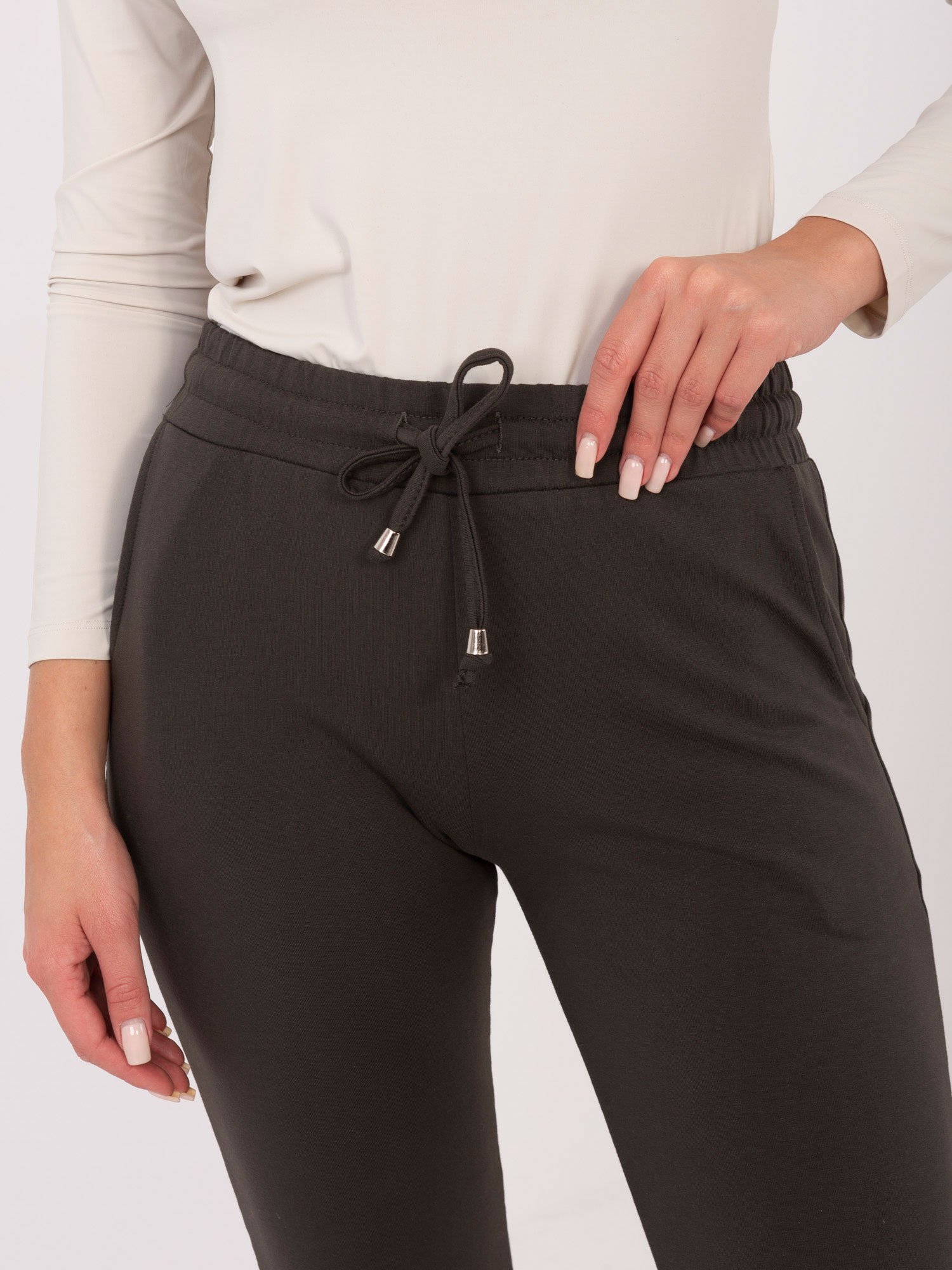 Ciemne khaki spodnie Faster Zgrabne i kobiece spodnie dresowe? Tak, to możliwe! Przedstawiamy Wam nasz bestseller z kolekcji ubrań basic, czyli modne i wygodne dresy damskie skrojone specjalnie z myślą o kobiecej figurze. Spodnie mają najmodniejszy fason slim fit z wąskimi nogawkami zakończonymi ściągaczami, które pięknie podkreślają nogi, a przy okazji nie uciskają i zapewniają całkowitą wygodę. W takim modelu będziesz czuła się kobieco i komfortowo, a poza tym łatwo dobierzesz do nich pozostałe części stylizacji. Te spodnie dresowe basic zrobione są z gładkiej i przyjemnej w dotyku dzianiny bawełnianej, która gwarantuje przewiewność oraz wyjątkową wygodę noszenia. Elastyczny pas z wiązanymi troczkami pozwala na regulowanie obwodu. Świetnie wyglądają zestawione z butami sportowymi oraz dopasowanymi bluzkami z naszej kolekcji online.