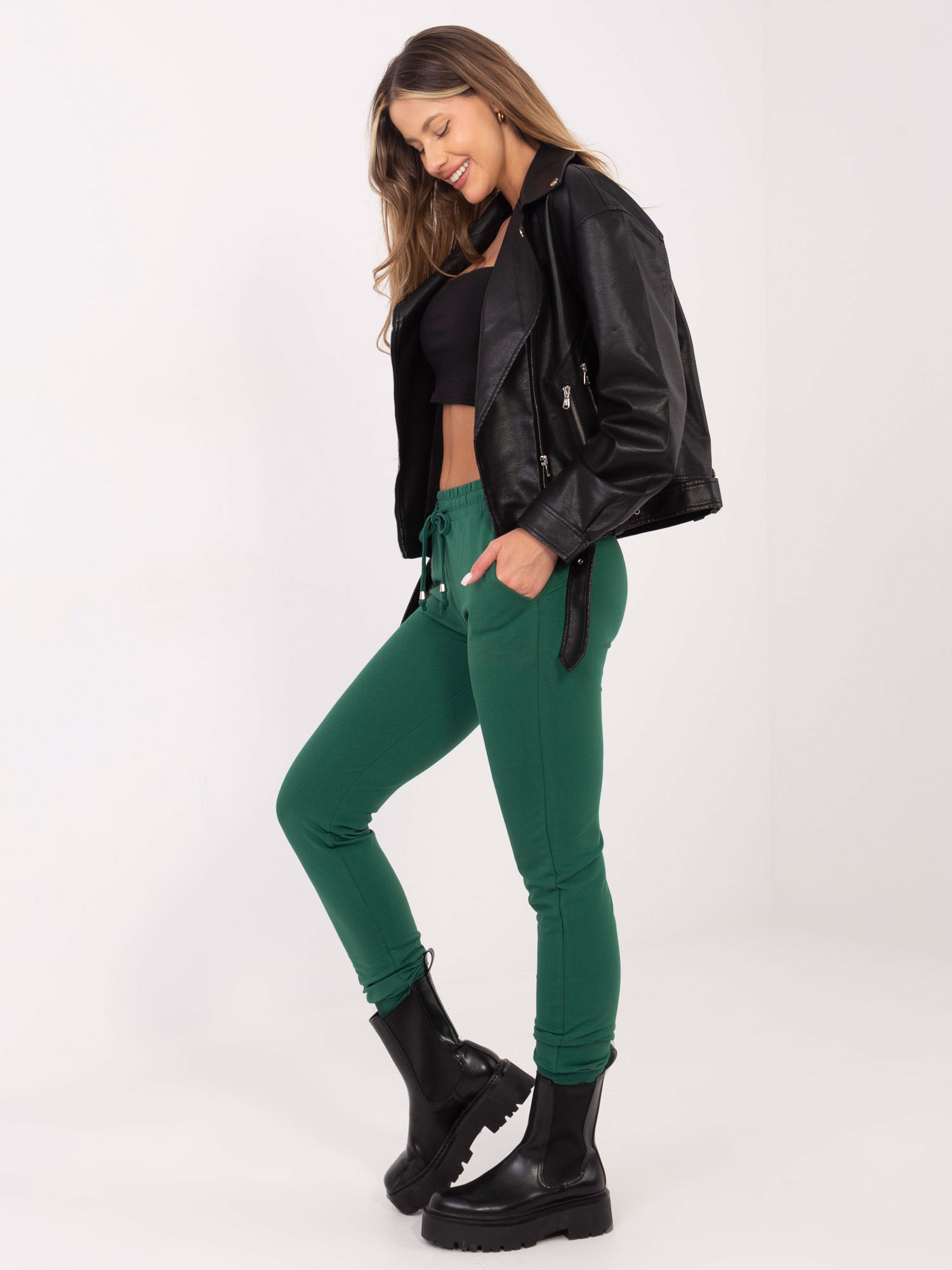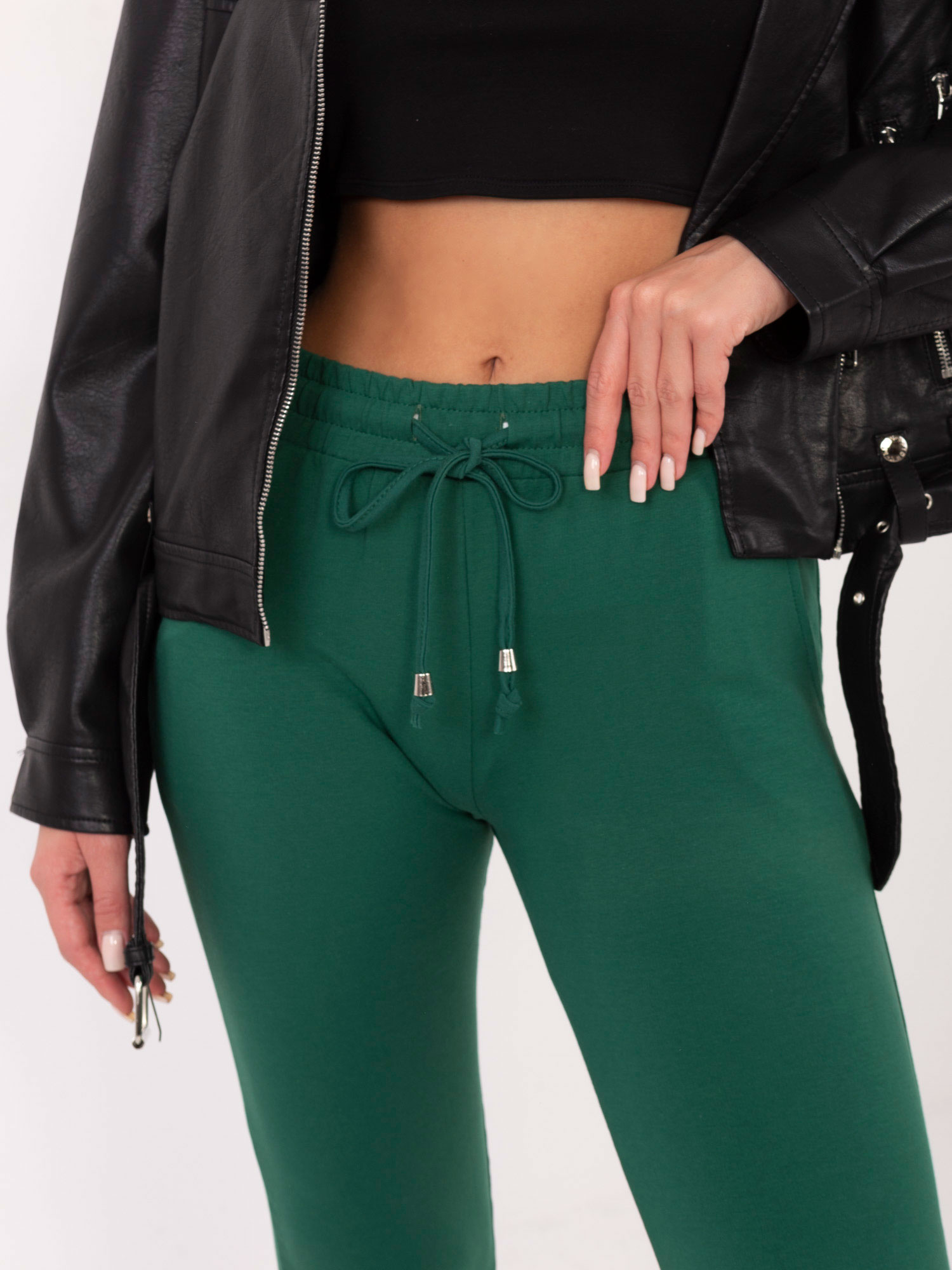 Ciemnozielone spodnie Faster To wyjątkowo udane połączenie gorących trendów oraz praktycznych zalet z pewnością znaleźć swoje miejsce w Twojej garderobie. Oryginalne spodnie dresowe basic zostały wykonane z tkaniny bawełnianej najwyższej jakości, która jest bardzo przyjemna w dotyku, a jednocześnie miękko układa sie na sylwetce. Prezentowany model zapewnia odpowiedni poziom termoregulacji. Zdecydowanie mogą po niego sięgać również osoby z wrażliwą skórą. Oryginalny kolor naszego produktu przyciągnie uwagę, a jednocześnie doda niezwykłości każdej, nawet najbardziej minimalistycznej stylizacji.