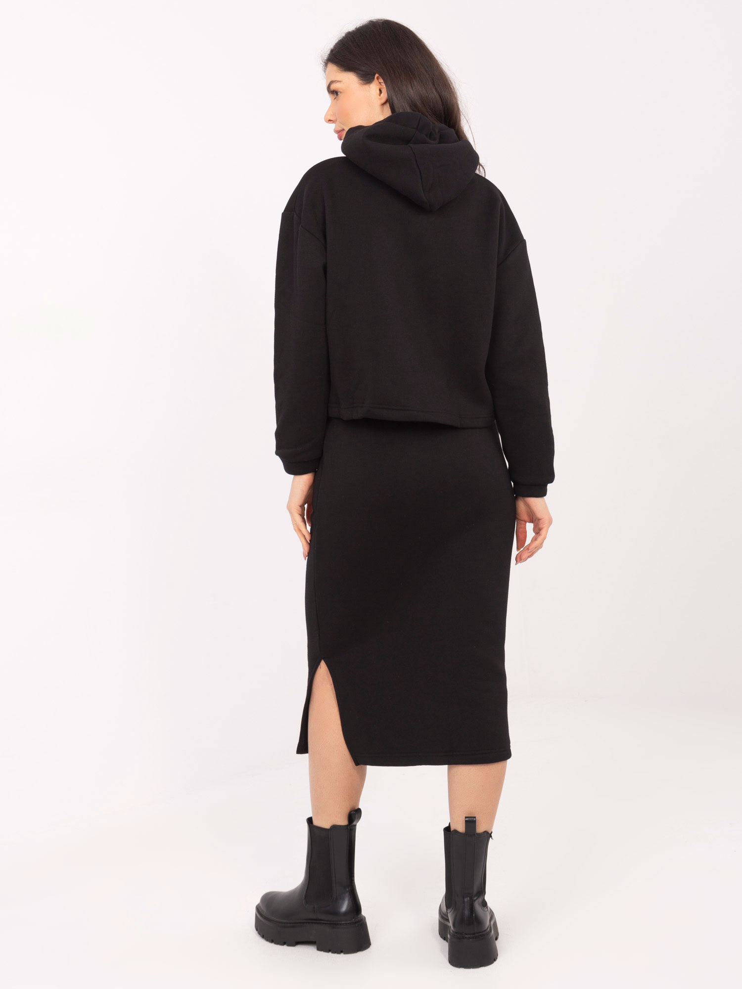 Wymiary kompletu w rozmiarze S mierzone na płasko: szerokość pod pachami - 59 cm, długość bluzy - 53 cm, długość rękawa - 50 cm, szerokość na dole - 55 cm, szerokość w pasie - 32 cm, szerokość w biodrach - 46 cm, długość spódnicy - 78 cm.