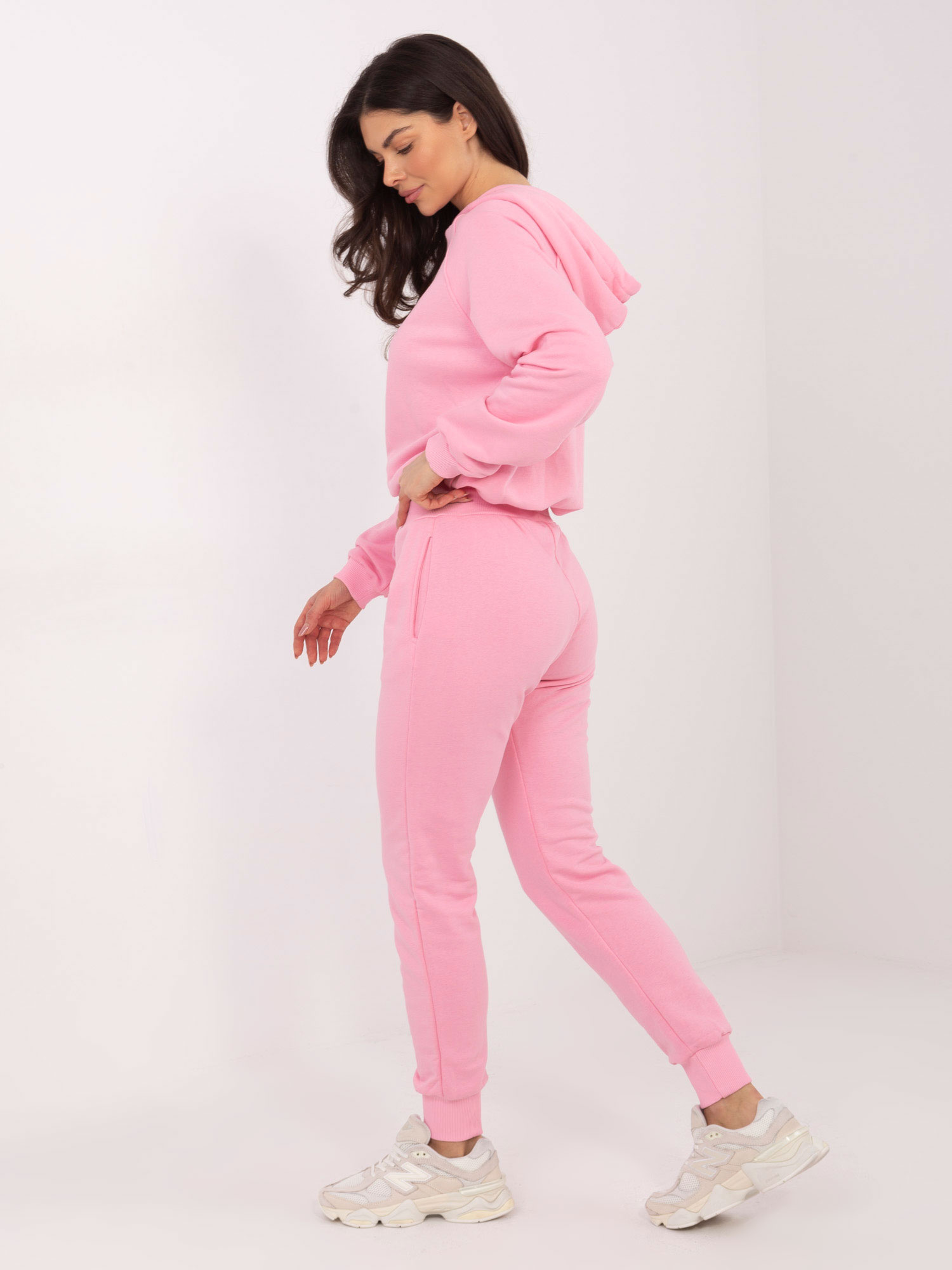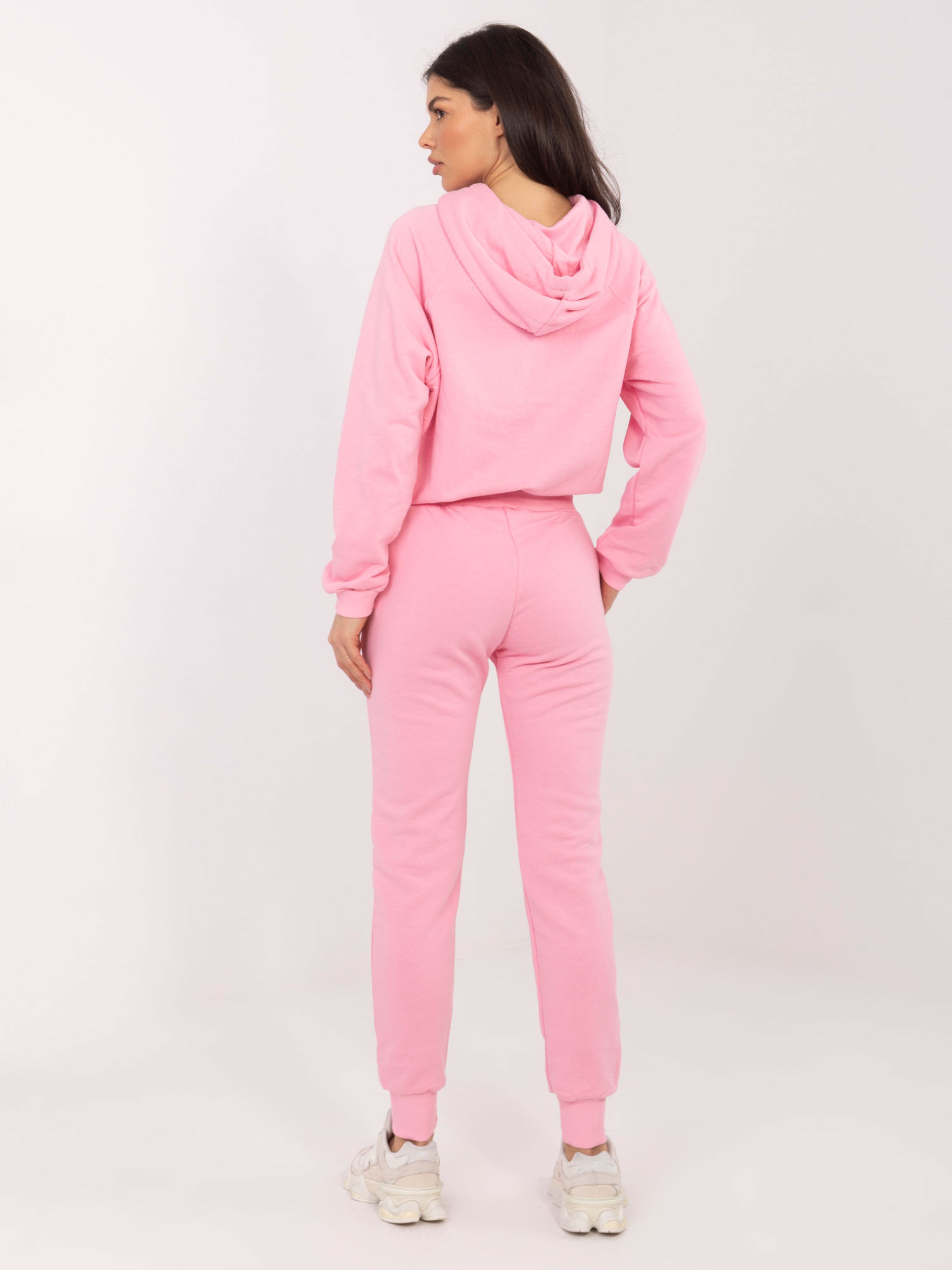 Na ten modny bawełniany dres składają się bluza z kapturem oraz spodnie. Górna część kompletu charakteryzuje się luźnym krojem, podczas gdy dół subtelnie podkreśla kształty kobiecego ciała. Bluza od tego kompletu z pewnością spodoba się fankom gorących trendów z powodu krótkiego kroju eksponującego brzuch oraz kaptura, który może służyć jako ochrona przed wiatrem. Dresowe joggery zostały wyposażone w ściągacze na nogawkach oraz w pasie, jak również regulujące troczki. Wielkim atutem naszego dresowego kompletu jest jego kolor. Delikatny, pastelowy odcień różu znakomicie wpisuje się w najnowsze sezonowe trendy. Wybierając dla siebie model w takim kolorze możesz mieć pewność, że nie zaliczysz modowej wpadki. Komplet w kolorze jasnoróżowym poprawi Ci nastrój i doda energii niezależnie od pogody za oknem.