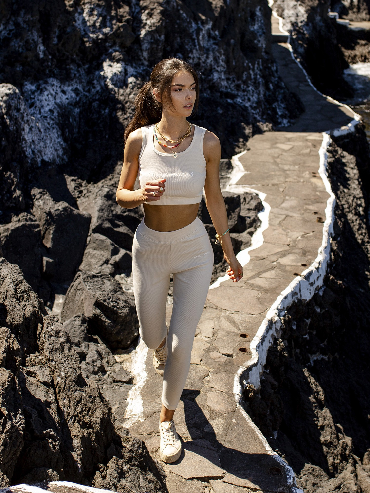 Opinie o Ecru prążkowany komplet sportowy FOR FITNESS
