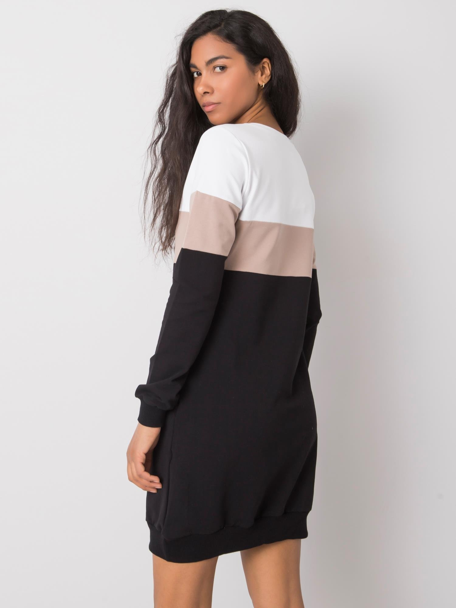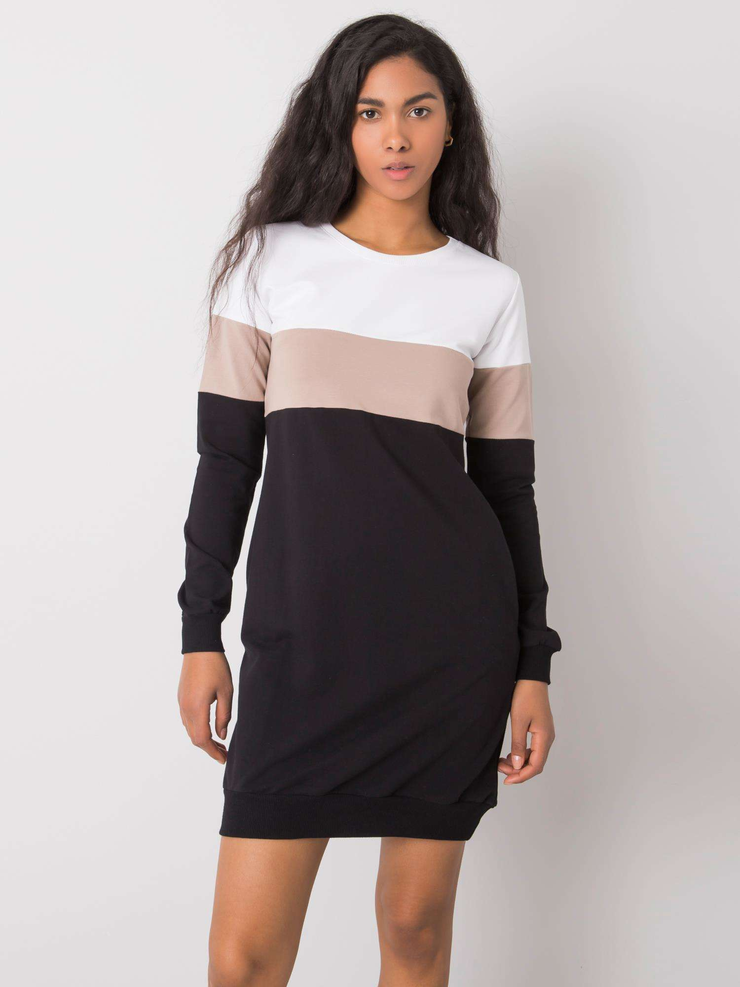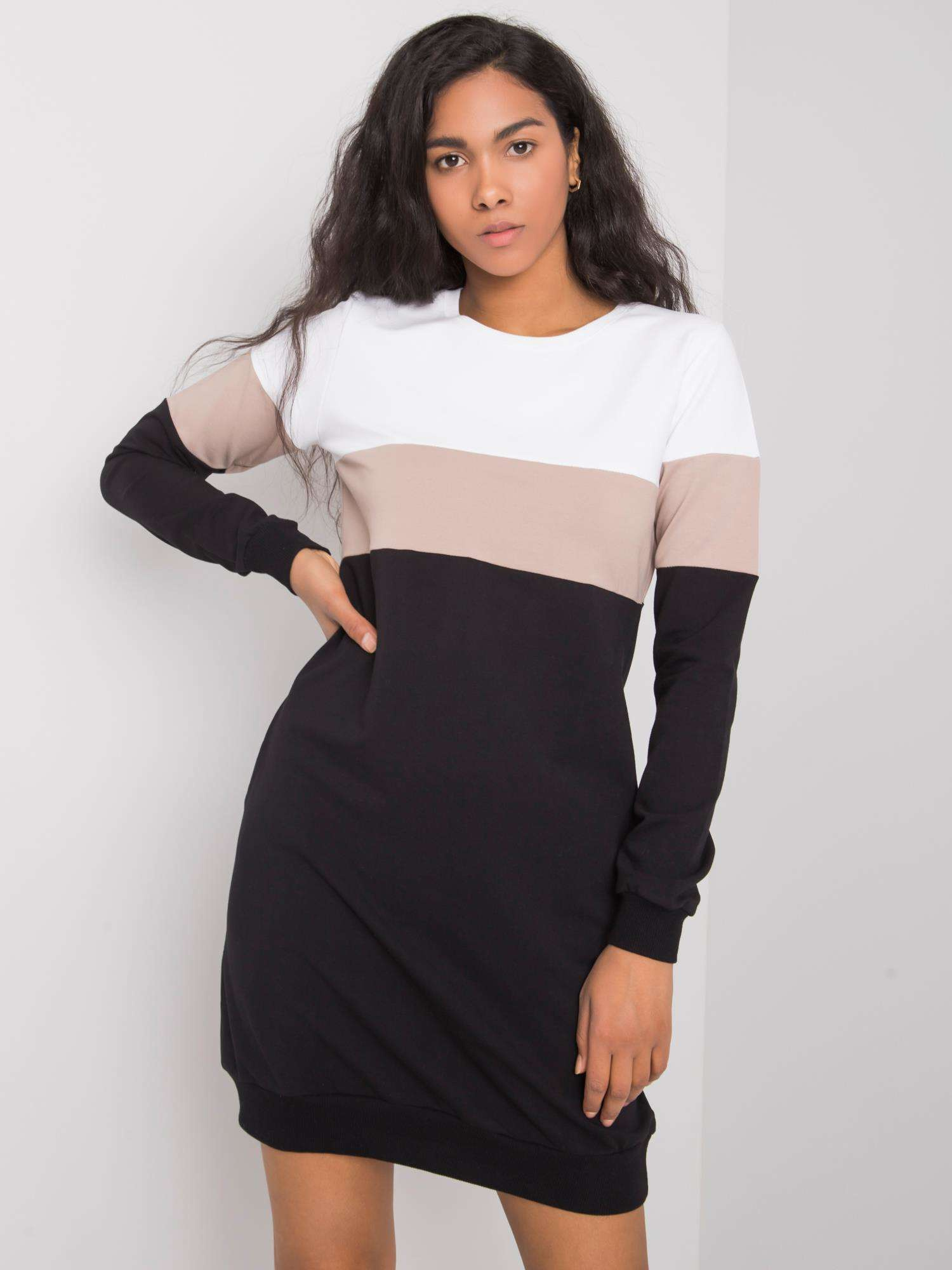 Wymiary sukienki w rozmiarze S mierzone na płasko: szerokość pod pachami - 45 cm, długość całkowita - 85 cm, długość rękawa - 60 cm