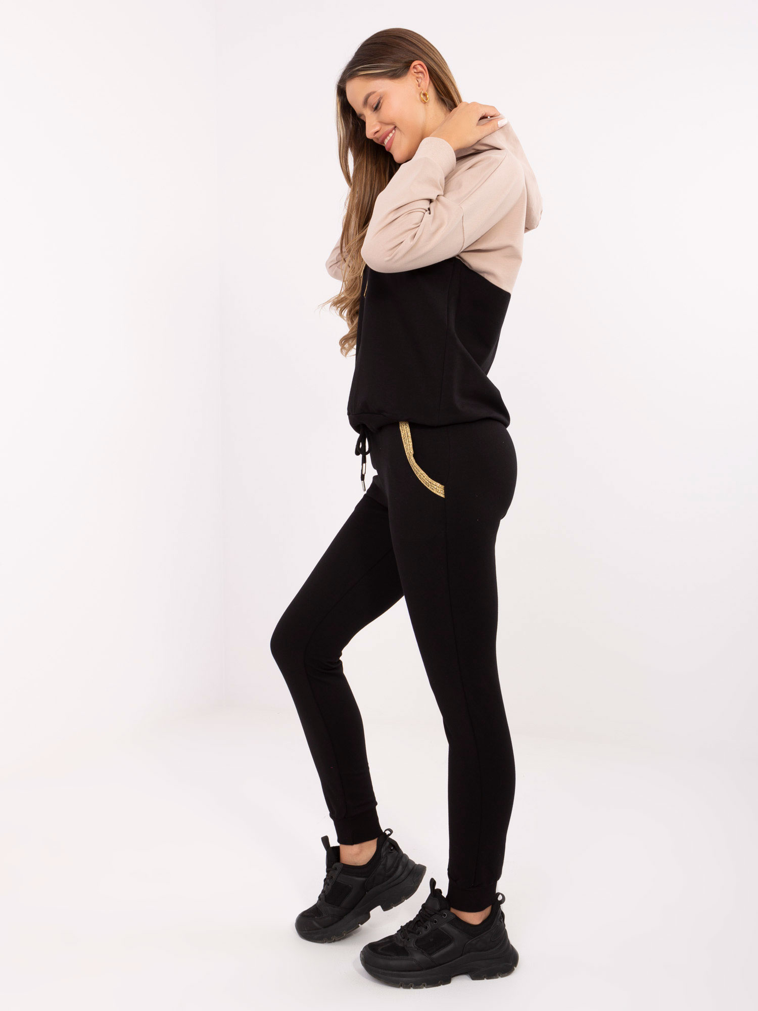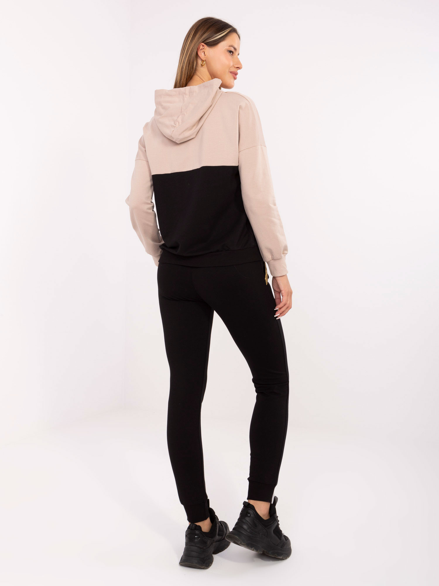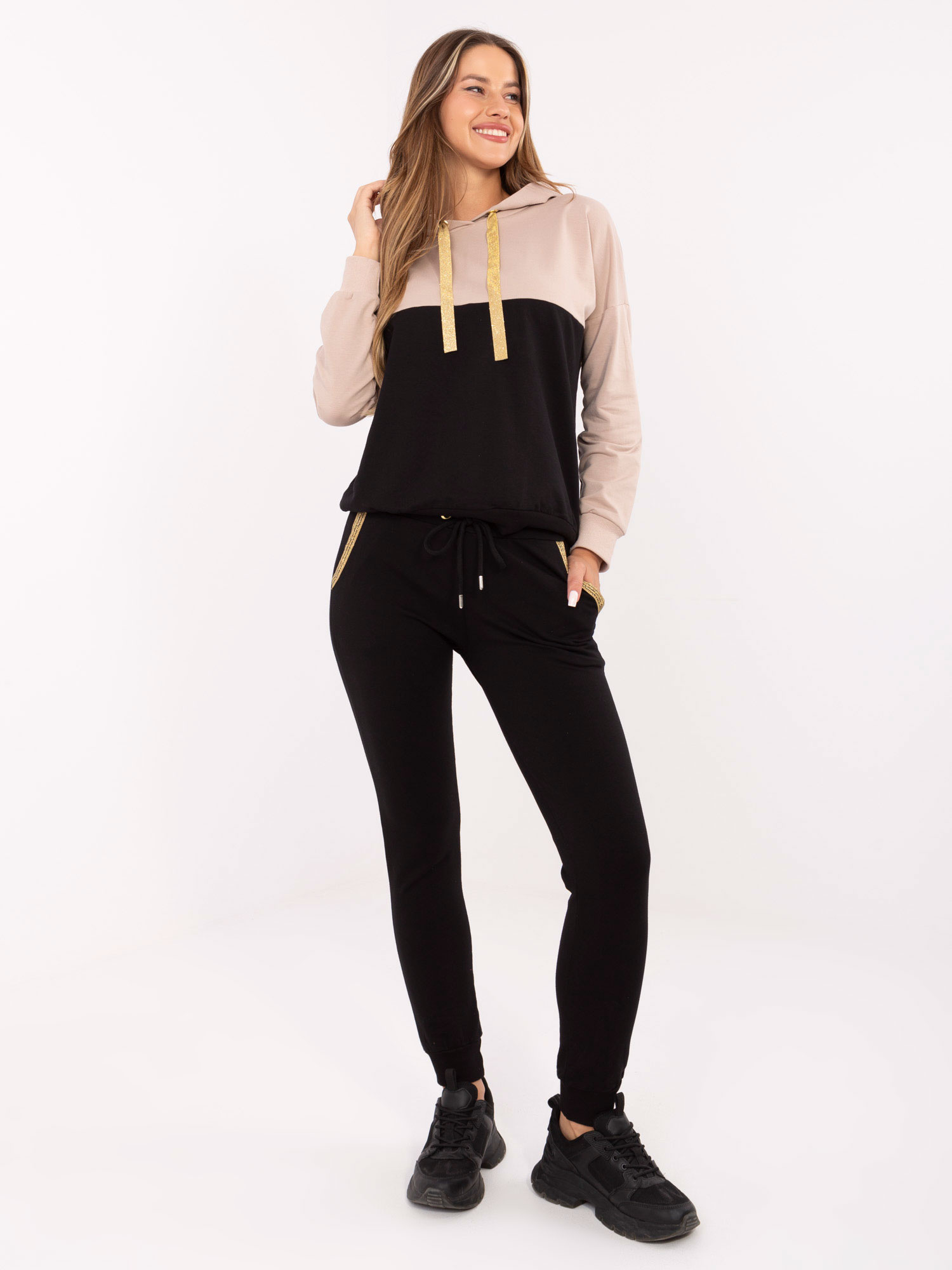 Beżowo-czarny komplet dresowy z bluzą z kapturem .