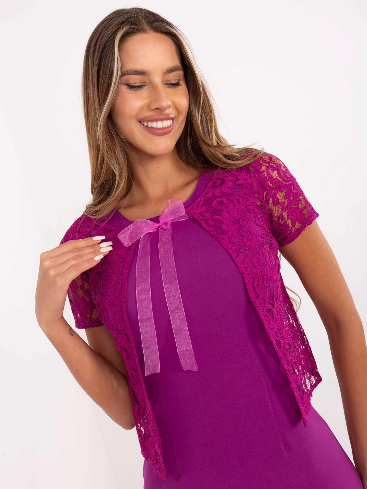 Opinie o Hurt Fioletowa ołówkowa sukienka koktajlowa z bolerkiem