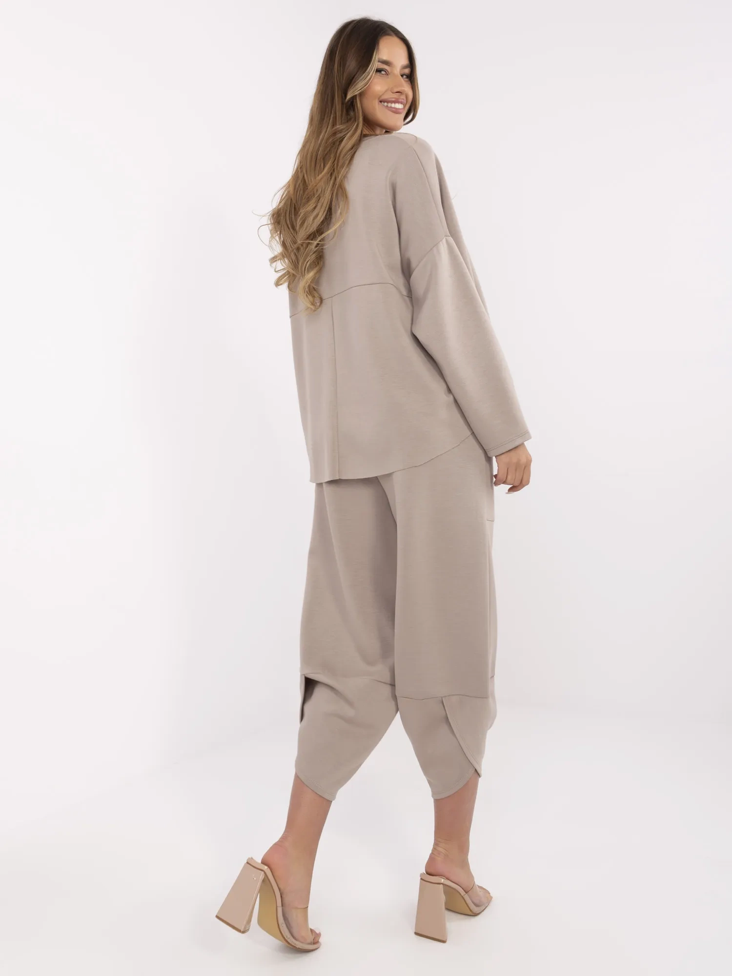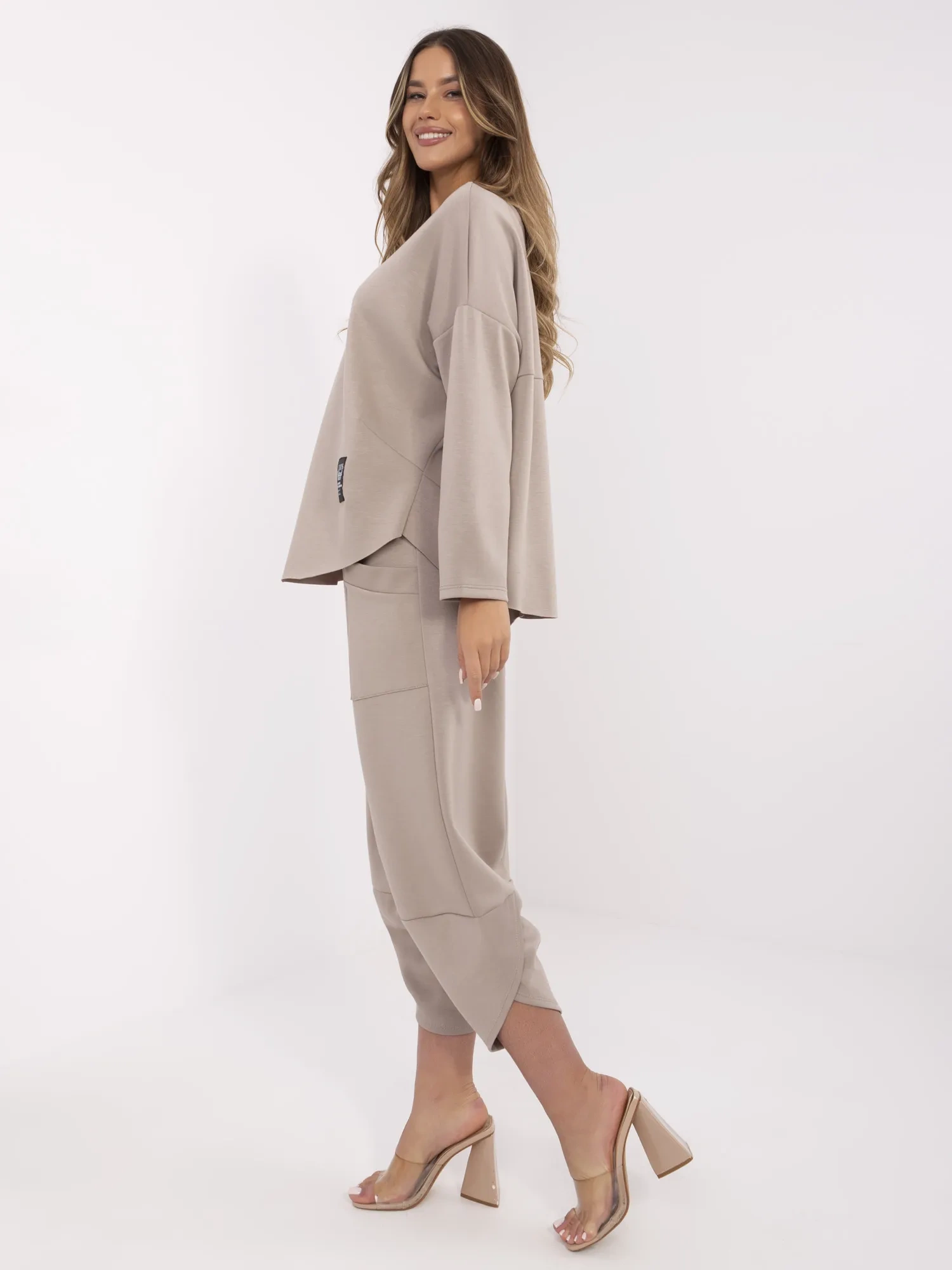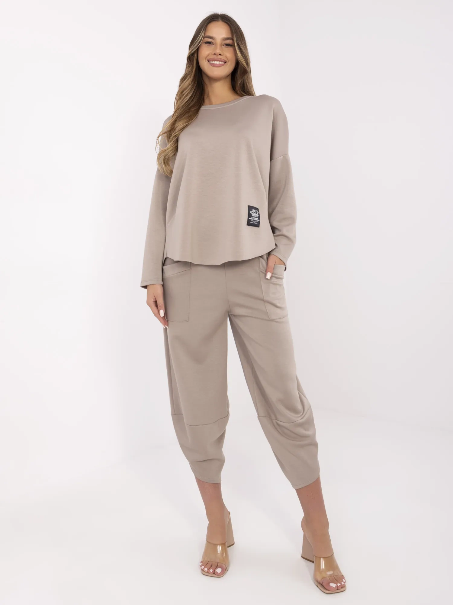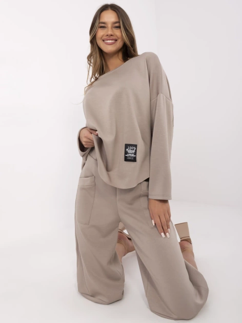 Ciemnobeżowy damski komplet z luźnymi spodniami