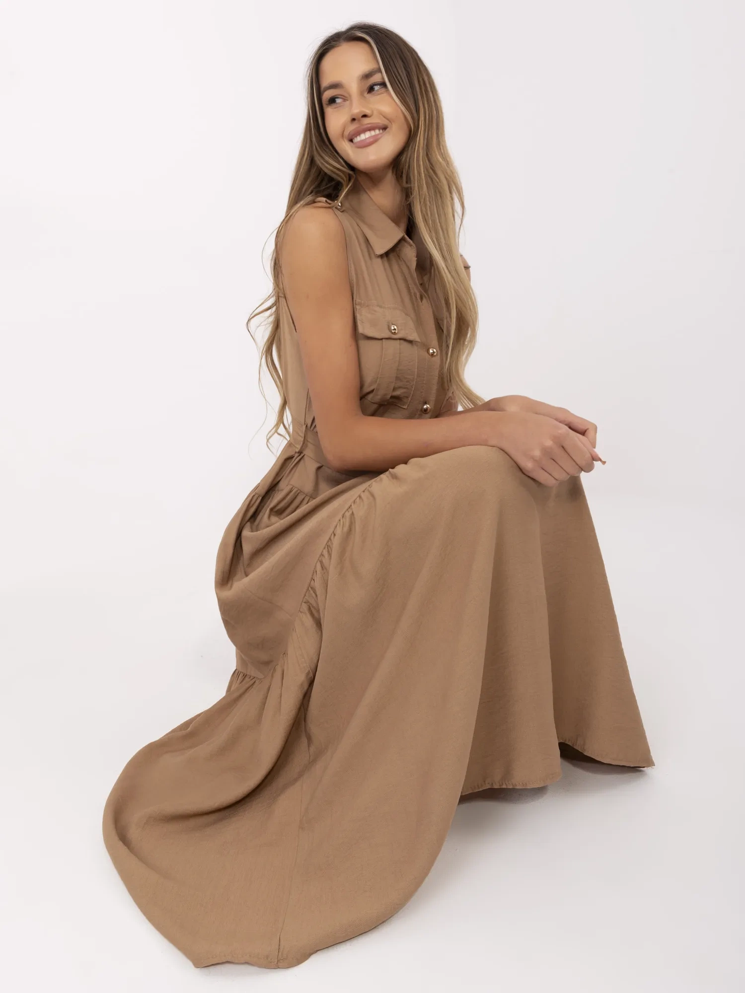 Camelowa długa sukienka z falbaną