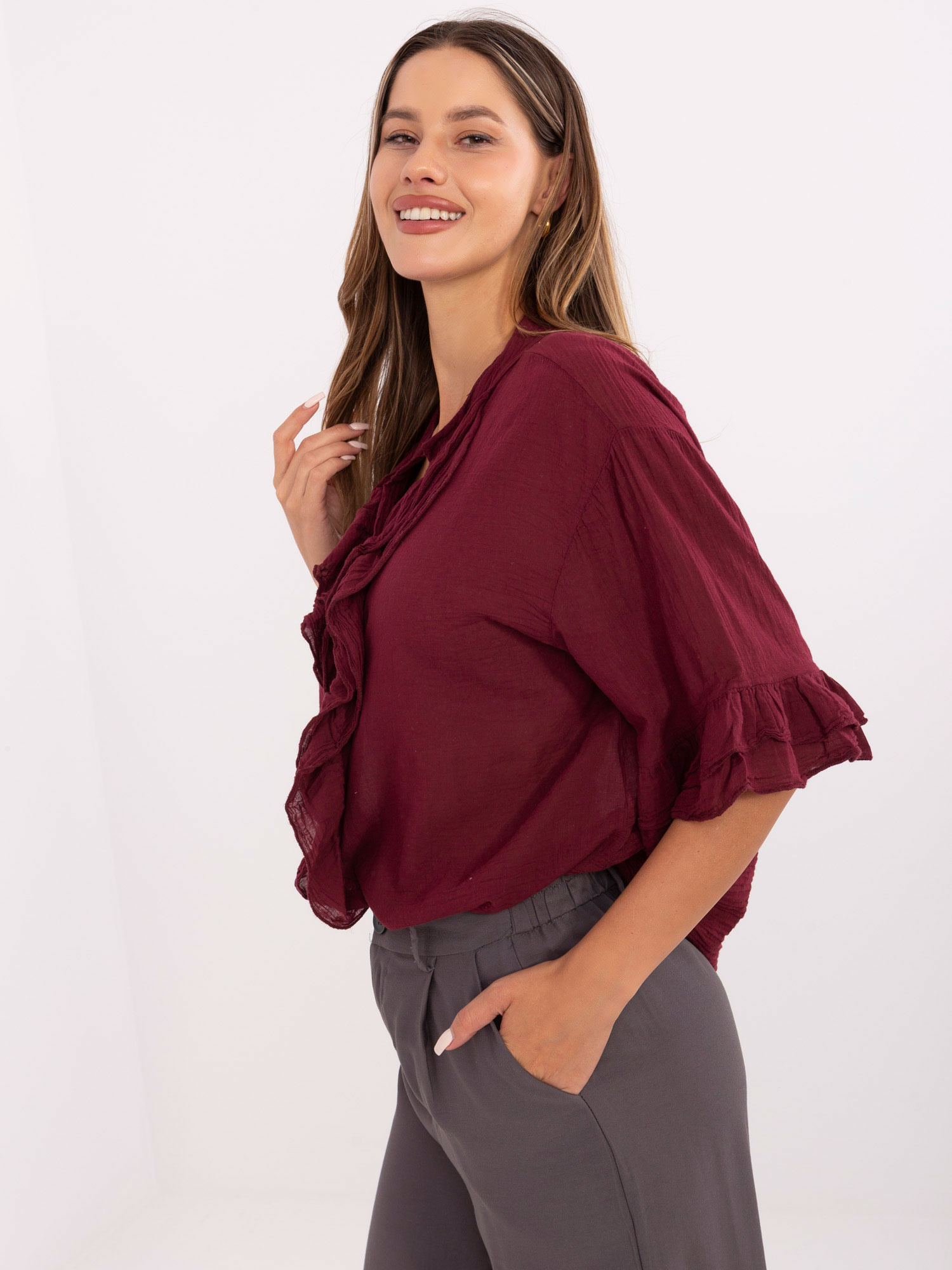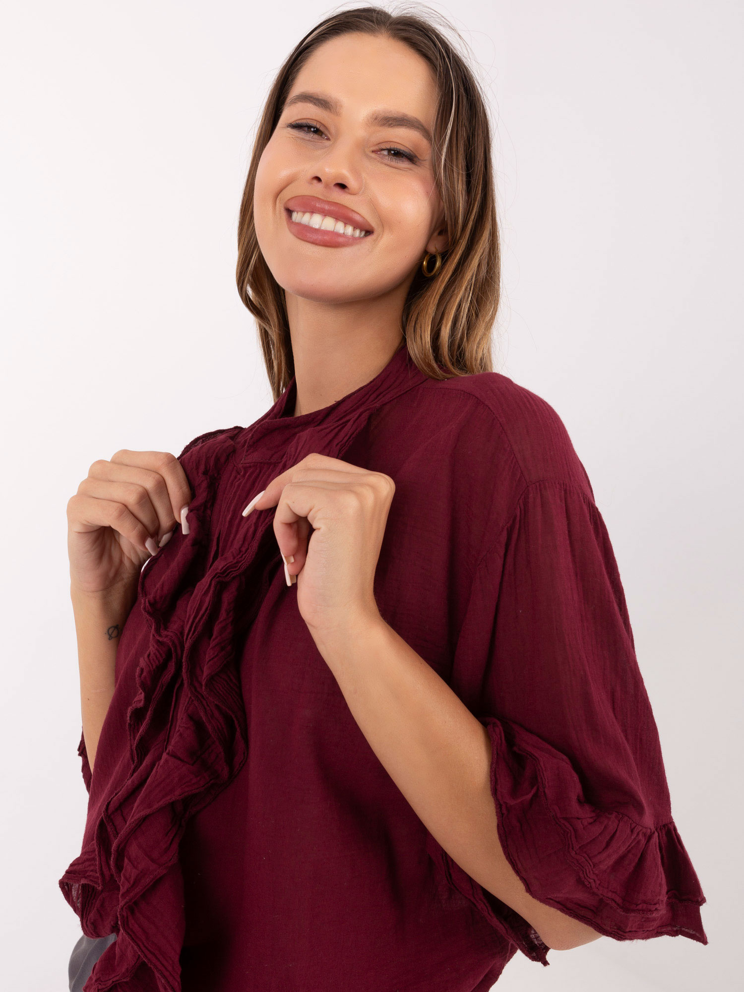 Opinie o Bordowa koszula z falbankami przy rękawach
