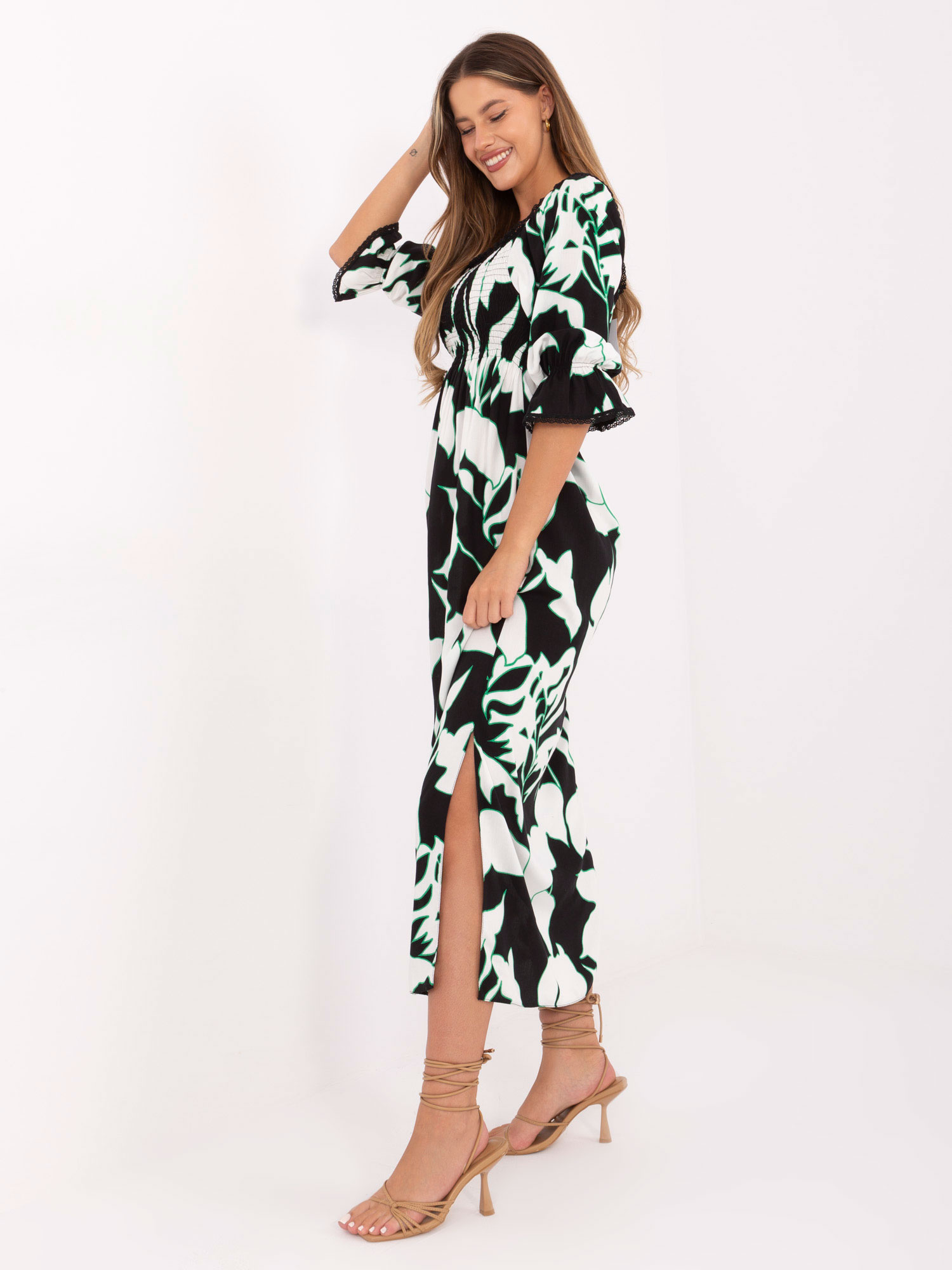 Wymiary sukienka w rozmiarze S/M: szerokość pod pachami - 22 cm (na płasko), szerokość pod pachami - 55 cm (po rozciągnięciu), szerokość w talii - 20 cm (na płasko), szerokość w talii - 20 cm (po rozciągnięciu), szerokość w biodrach - 59 cm, długość rękawa - 49 cm, długość całkowita - 132 cm .