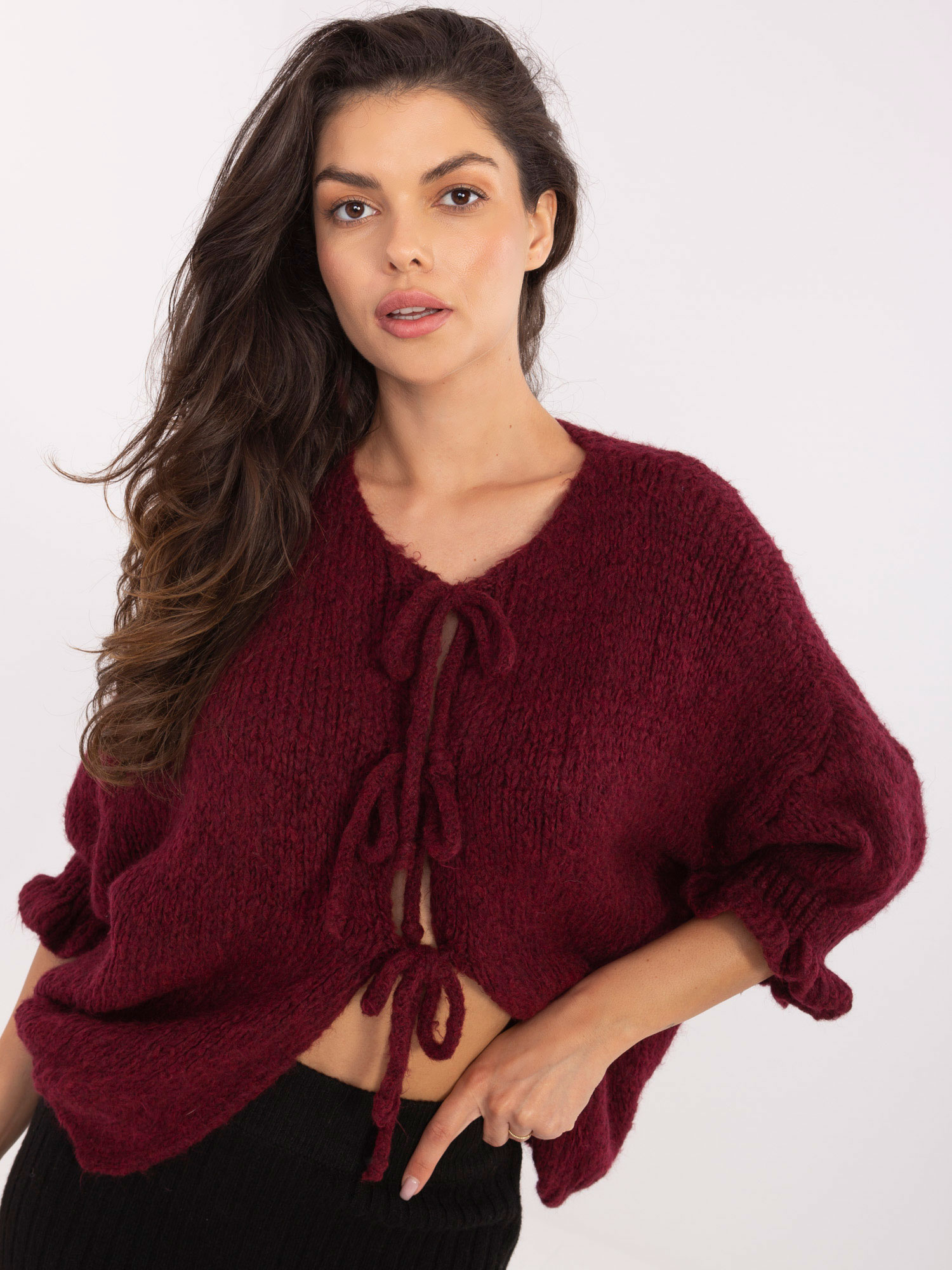 Opinie o Bordowy kardigan z falbankami przy rękawach