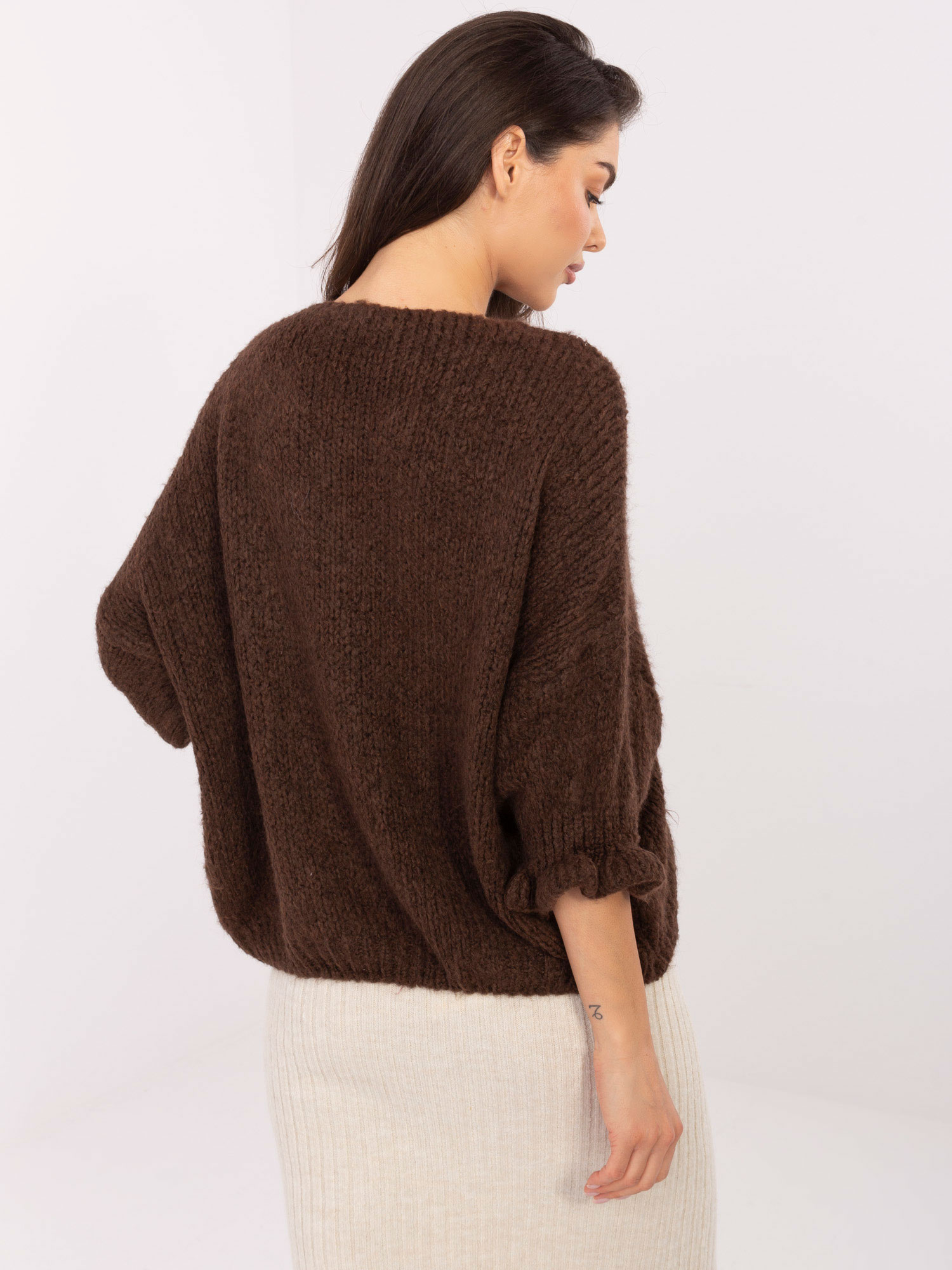 Wymiary swetra w rozmiarze one size mierzone na płasko: szerokość pod pachami - 63 cm, długość rękawa - 46 cm, szerokość w biodrach - 54 cm, długość całkowita - 64 cm.< /p>