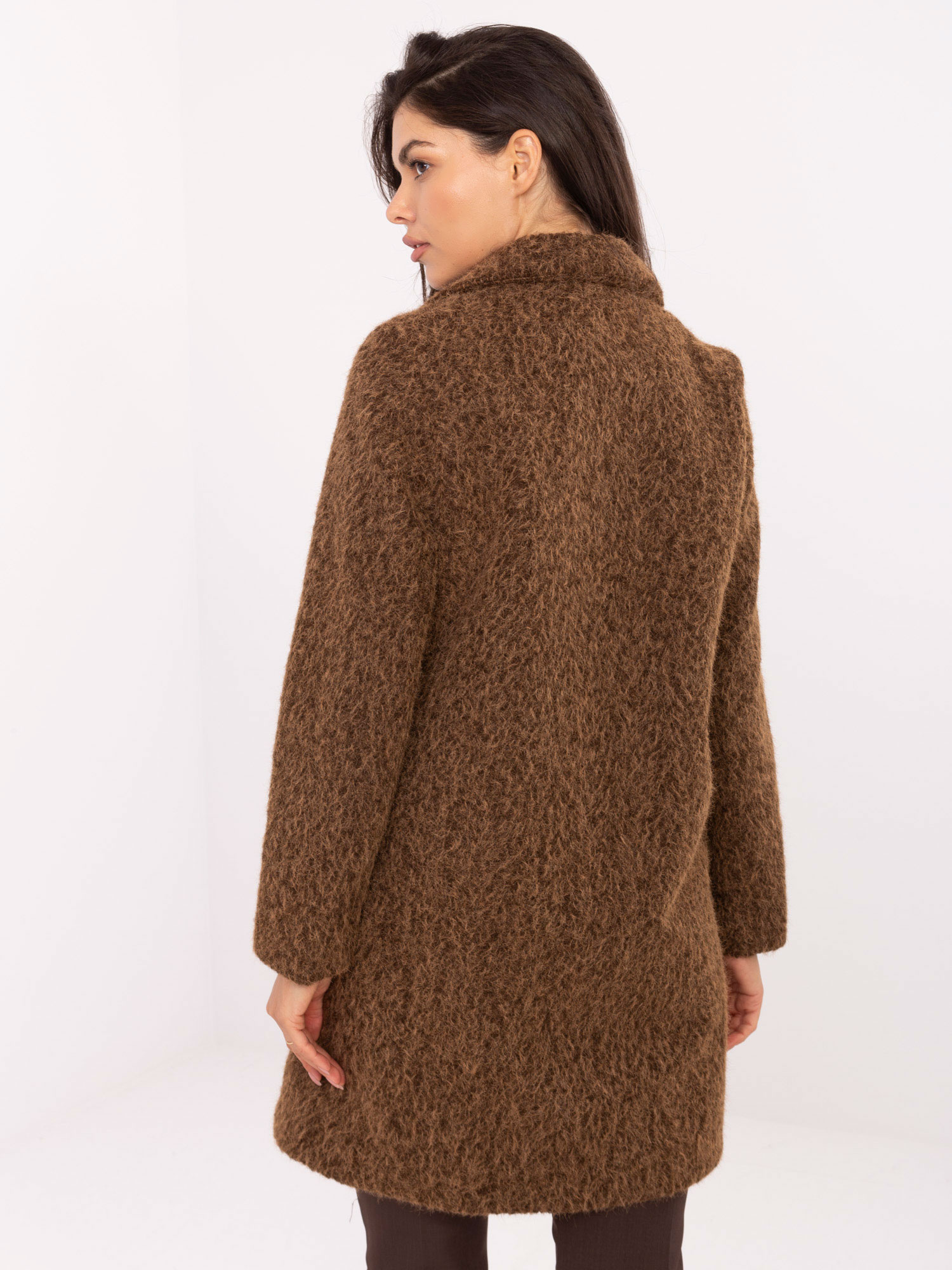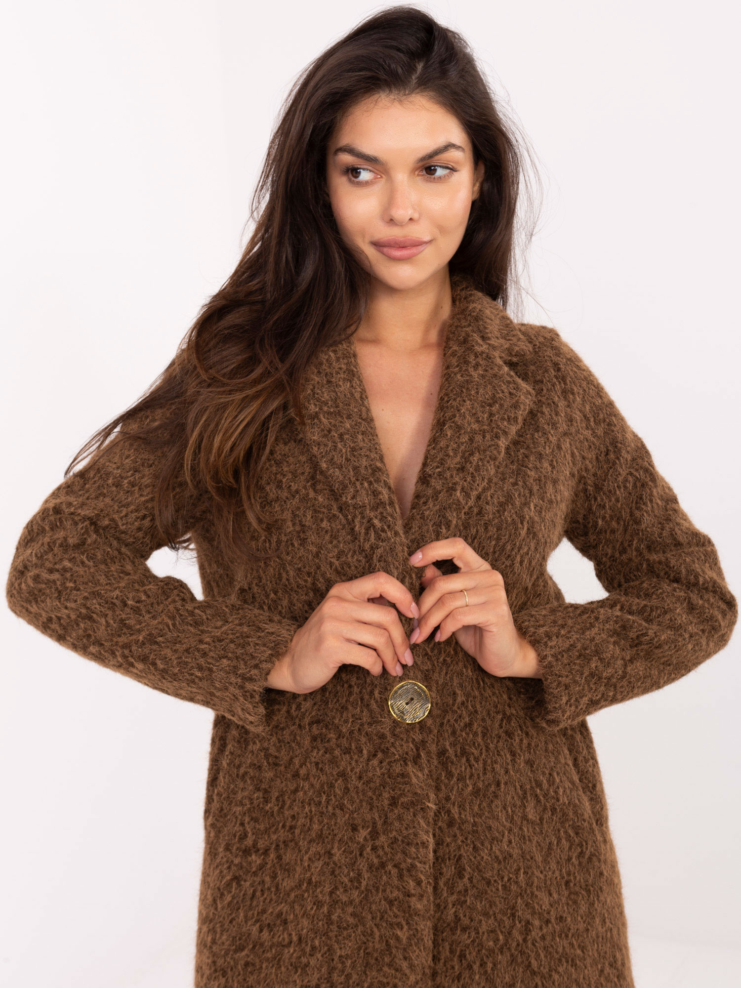 Brązowy damski płaszcz z kieszeniami