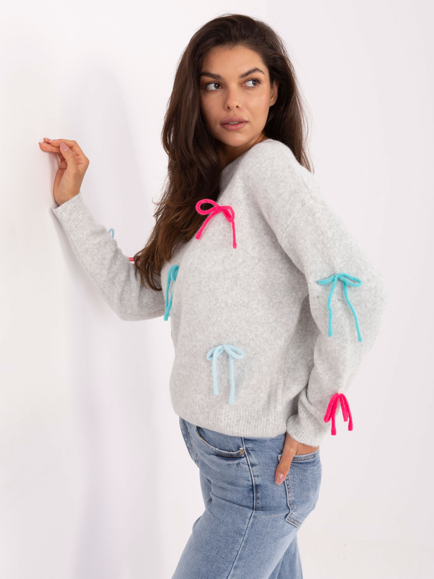 Wymiary swetra w rozmiarze one size mierzone na płasko: szerokość pod pachami - 62 cm, długość rękawa - 48 cm, długość całkowita - 57 cm, szerokość w biodrach - 52 cm.
