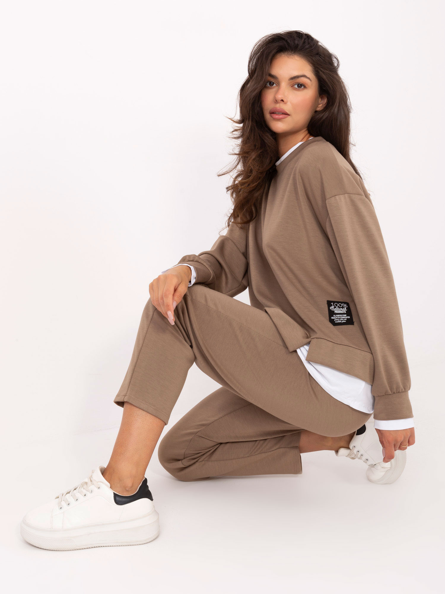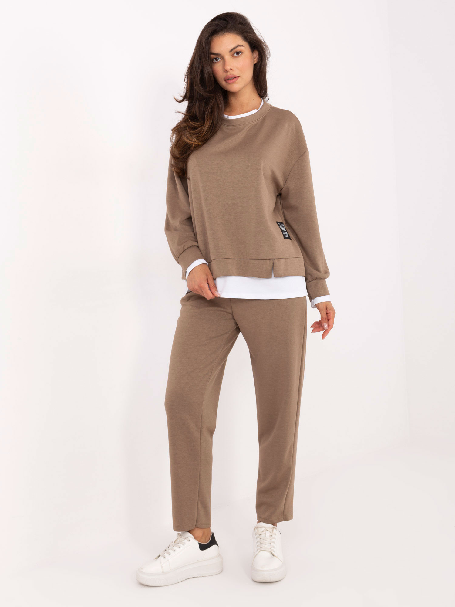 Wymiary kompletu w rozmiarze one size : szerokość pod pachami - 58 cm, długość bluzy - 64 cm, długość rękawa - 49 cm (od szwu), szerokość w biodrach - 59 cm, szerokość spodni w pasie - 32 cm (na płasko), szerokość spodni w pasie - 63 cm (po rozciągnięciu), szerokość w biodrach - 51 cm, długość spodni - 96 cm.