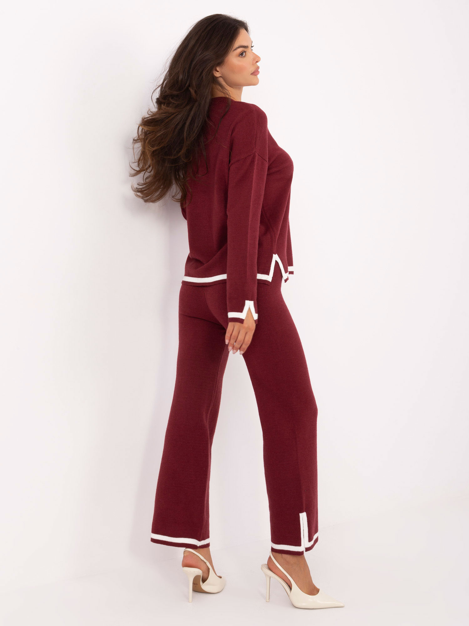 Wymiary kompletu w rozmiarze one size : szerokość pod pachami - 56 cm, długość swetra - 66 cm, długość rękawa - 48 cm (od szwu), szerokość w biodrach - 54 cm, szerokość spodni w pasie - 34 cm (na płasko), szerokość spodni w pasie - 67 cm (po rozciągnięciu), szerokość w biodrach - 37 cm, długość spodni - 103 cm.