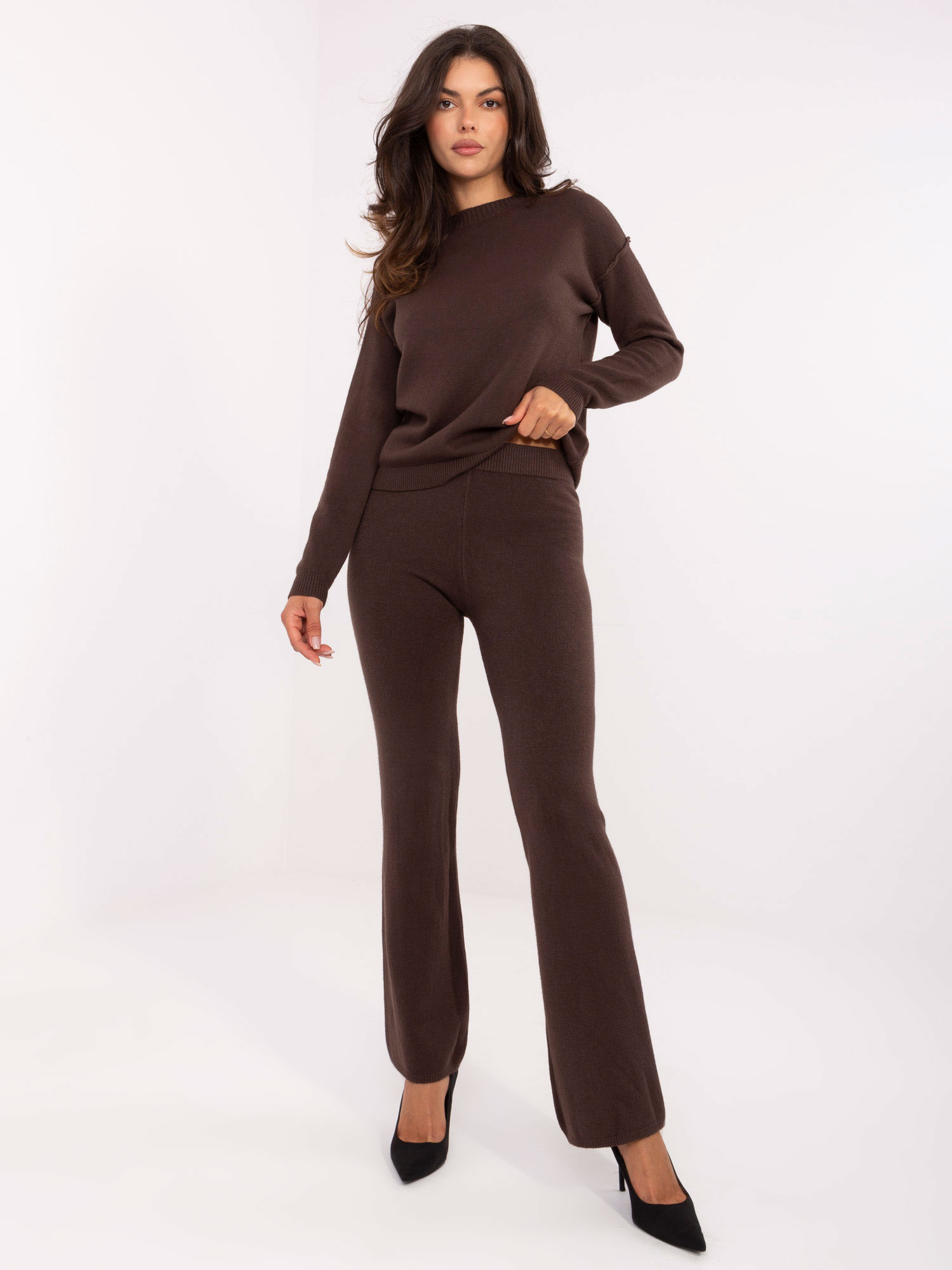 Ciemnobrązowy damski komplet z rozszerzanymi spodniami