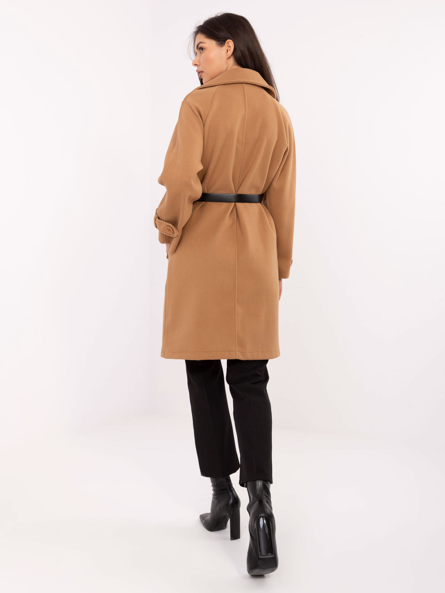 Wymiary płaszcza w rozmiarze one size mierzone na płasko: szerokość pod pachami - 53 cm, długość rękawa - 69 cm (od szwu), szerokość w biodrach - 54 cm, długość całkowita - 94 cm.