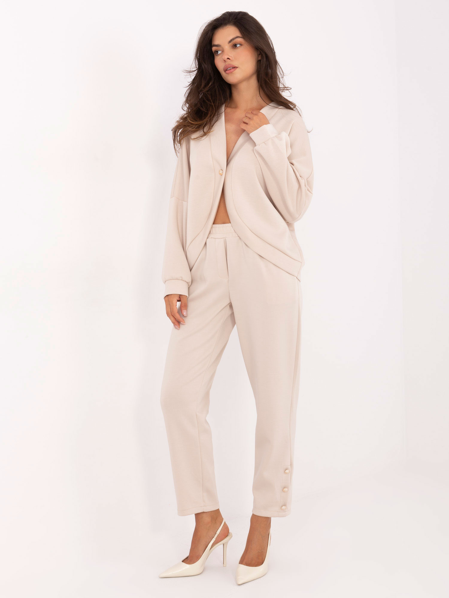 Beżowy komplet z ozdobnymi guzikami RUE PARIS .
