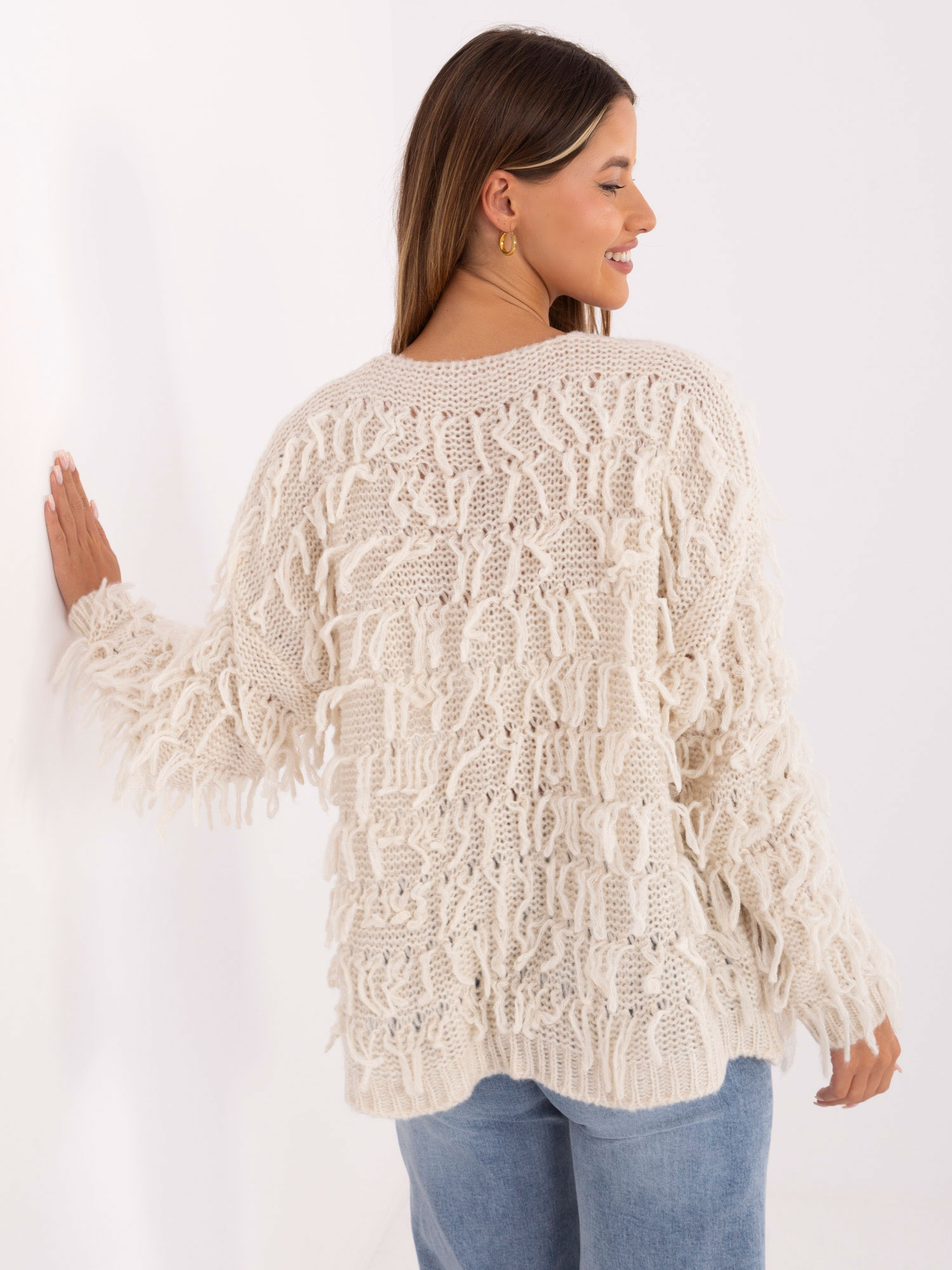 Wymiary swetra w rozmiarze one size mierzone na płasko: szerokość pod pachami - 67 cm, długość rękawa - 52 cm (od szwu), długość całkowita - 66 cm, szerokość w biodrach - 65 cm.