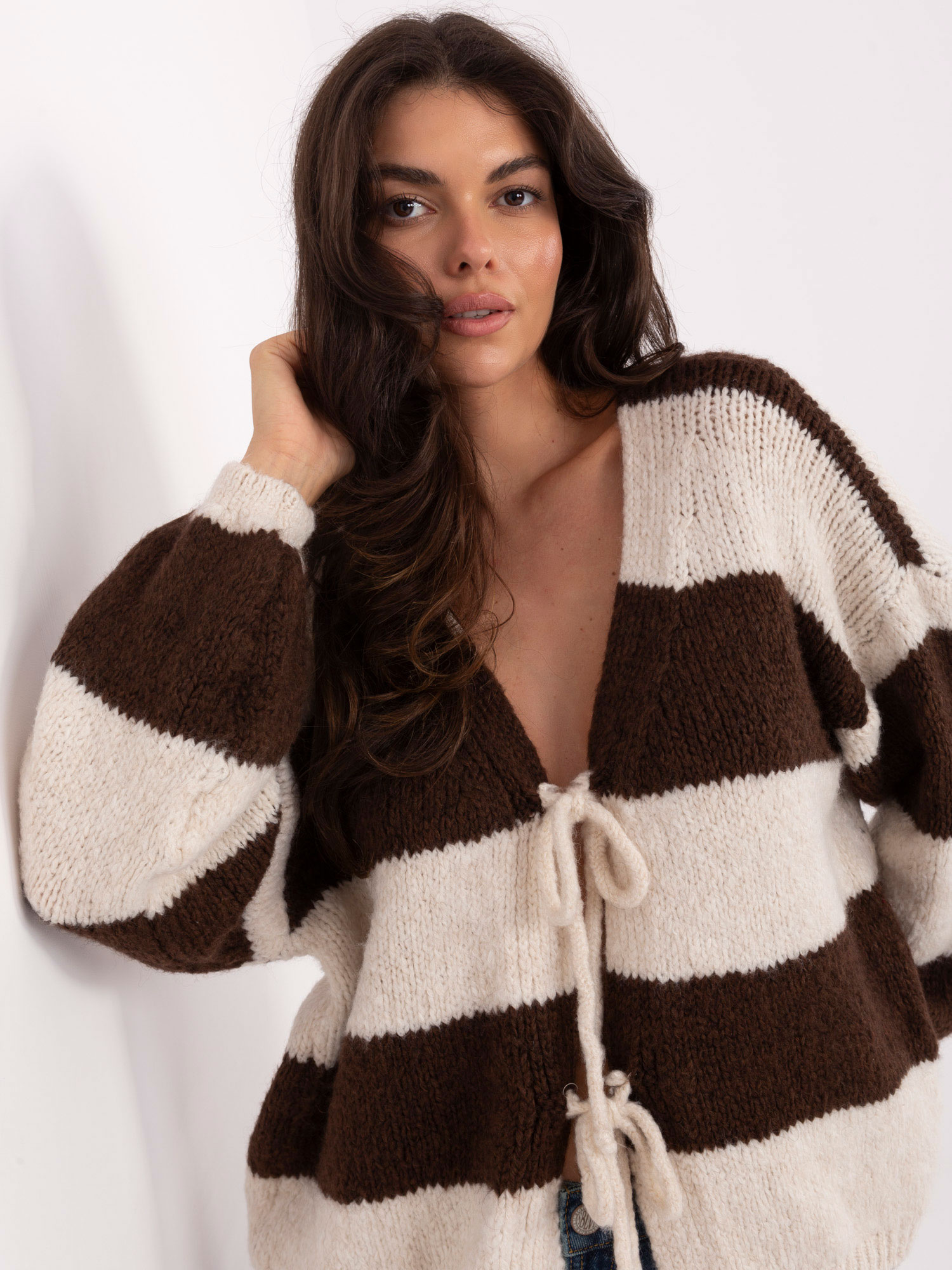 Ecru-brązowy sweter oversize z wiązaniem RUE PARIS .