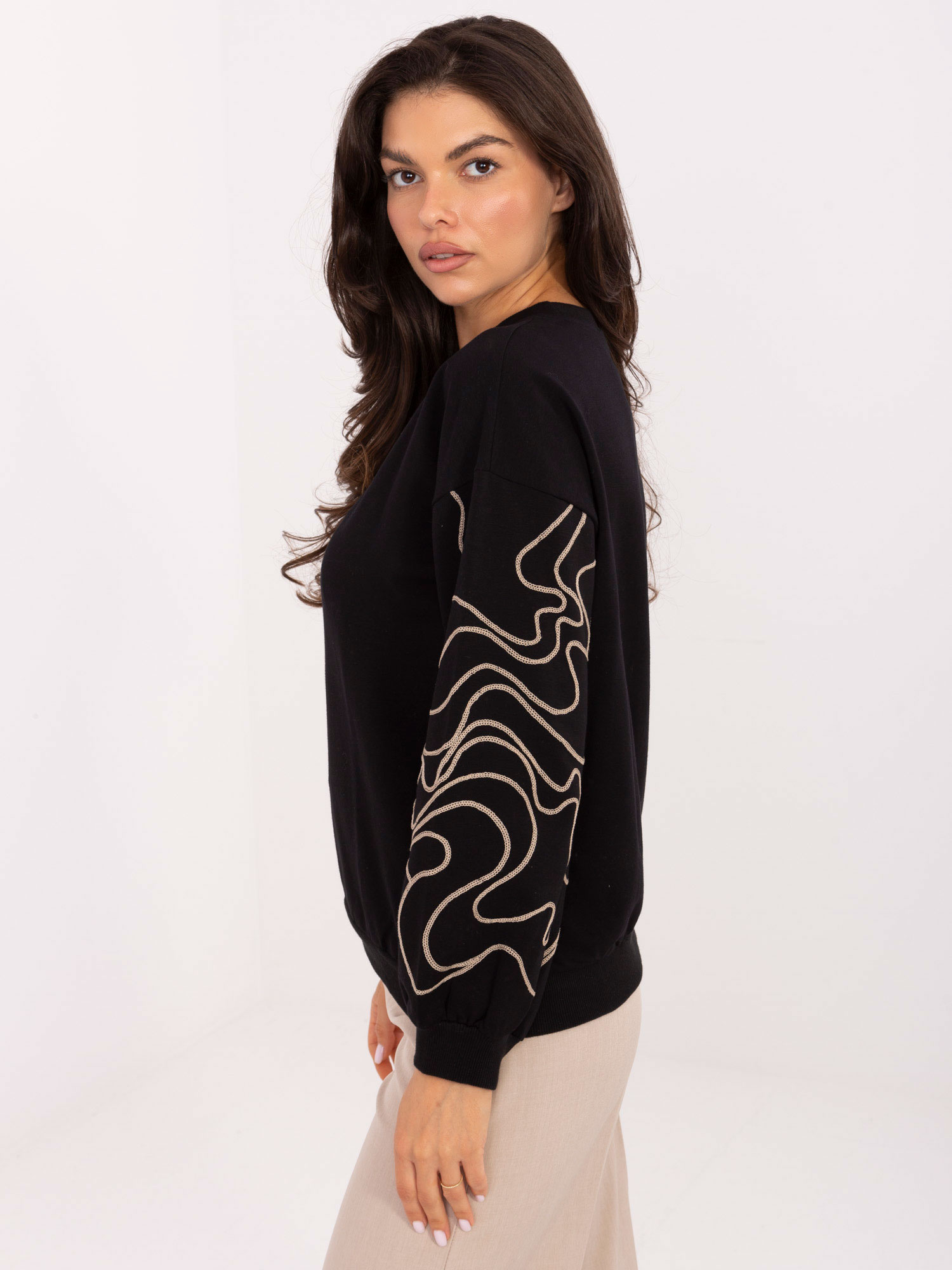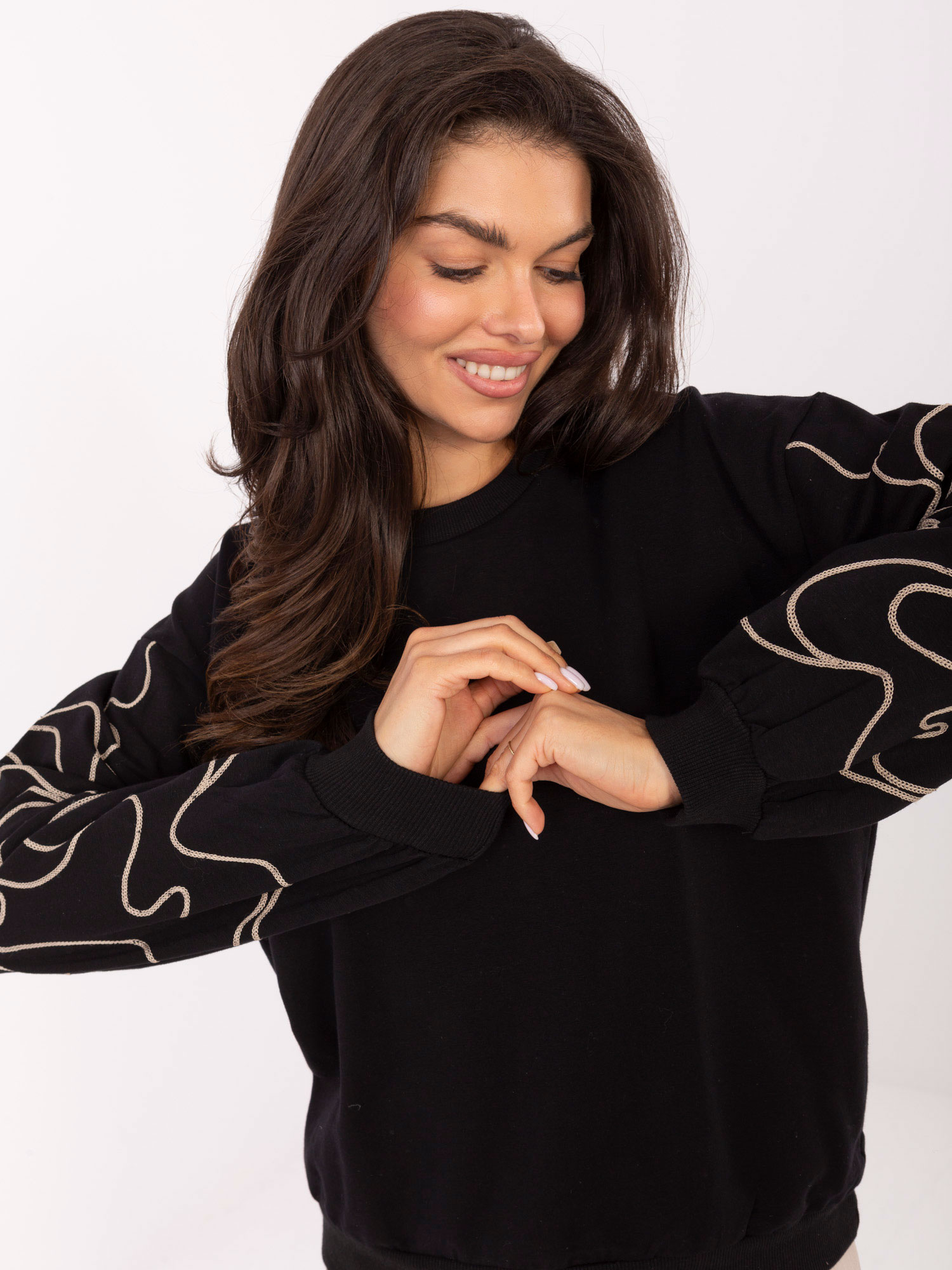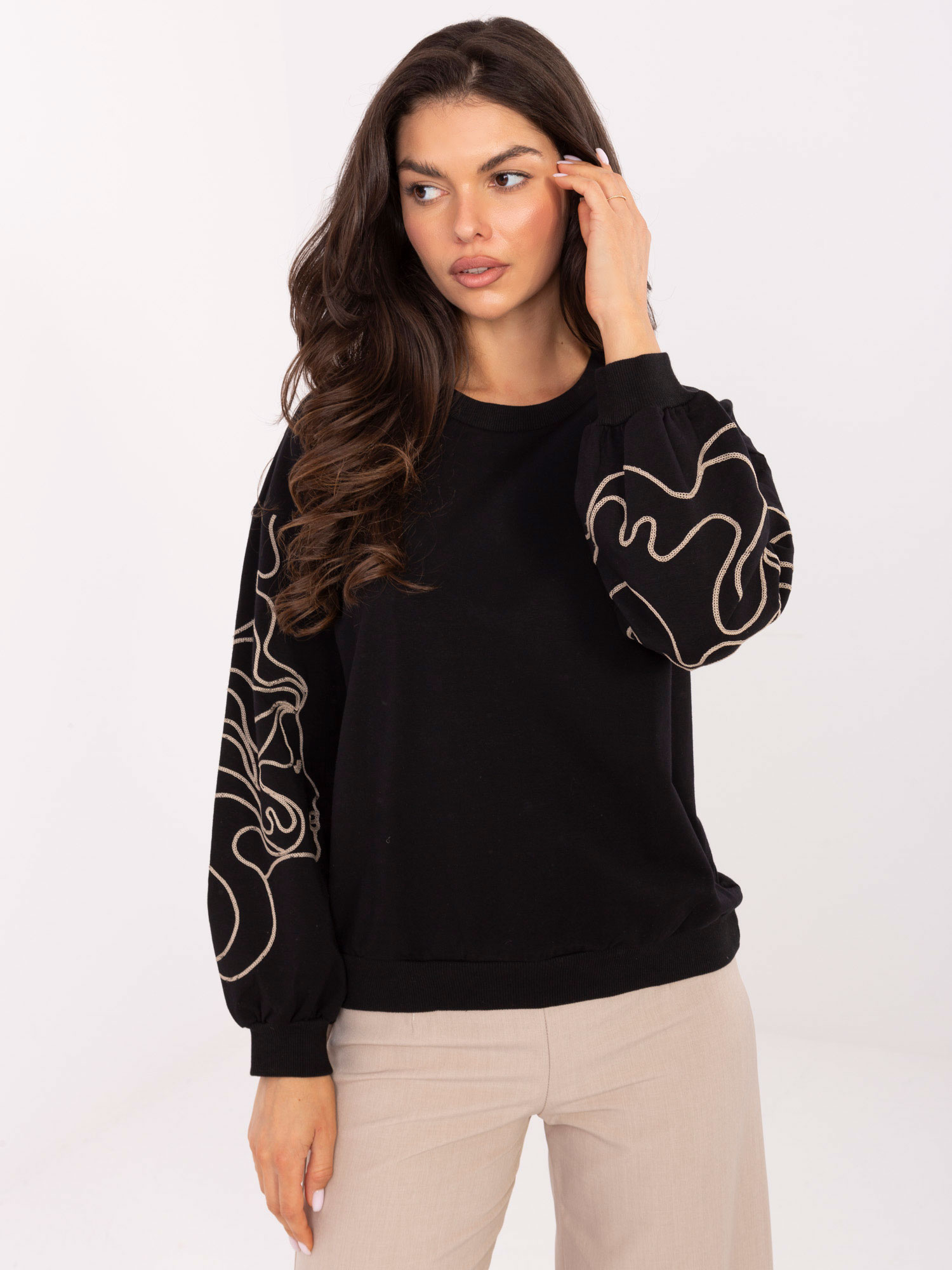 Czarna damska bluza z haftem na rękawach .