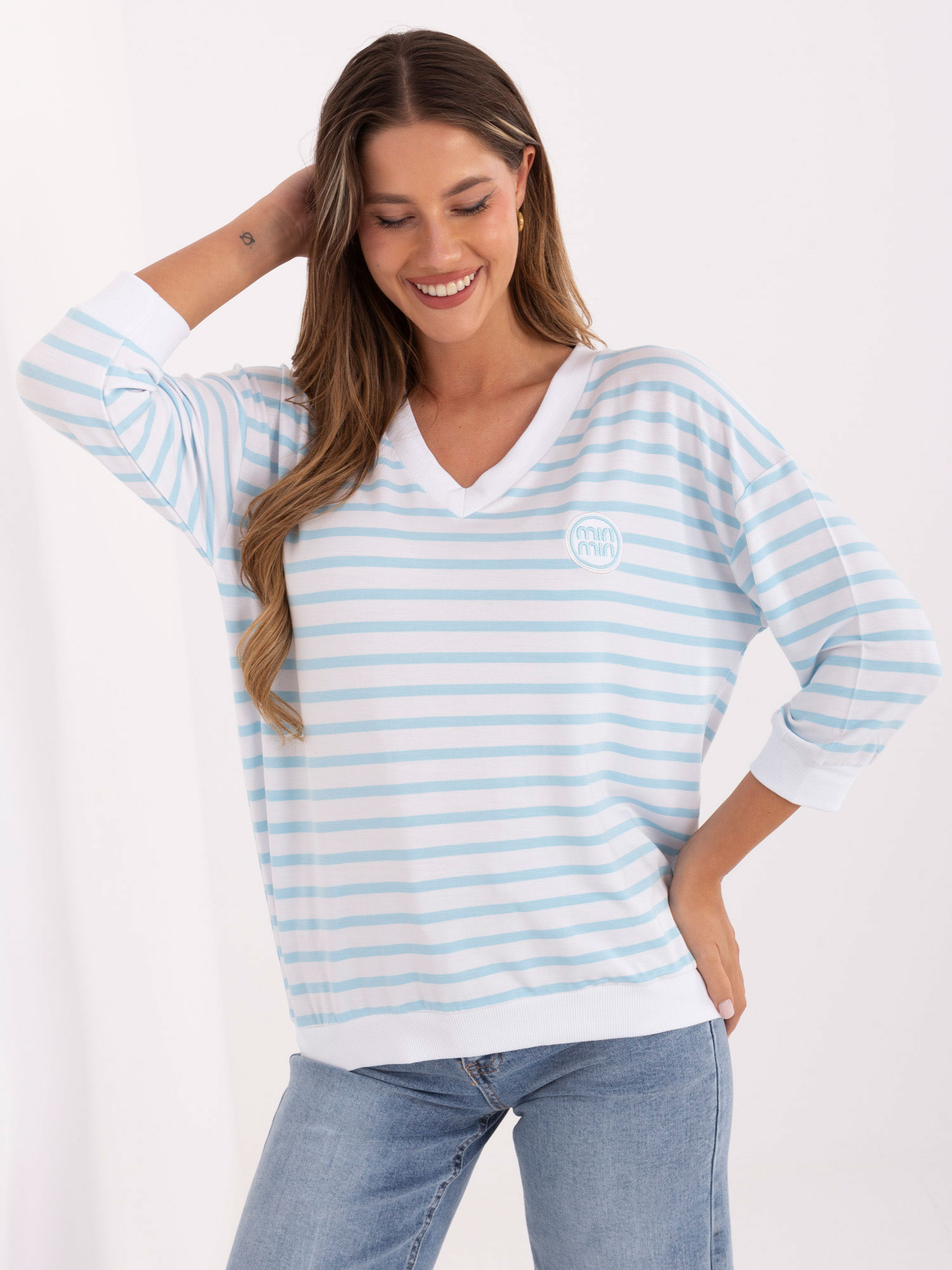 Biało-jasnoniebieska bluzka oversize z naszywką .