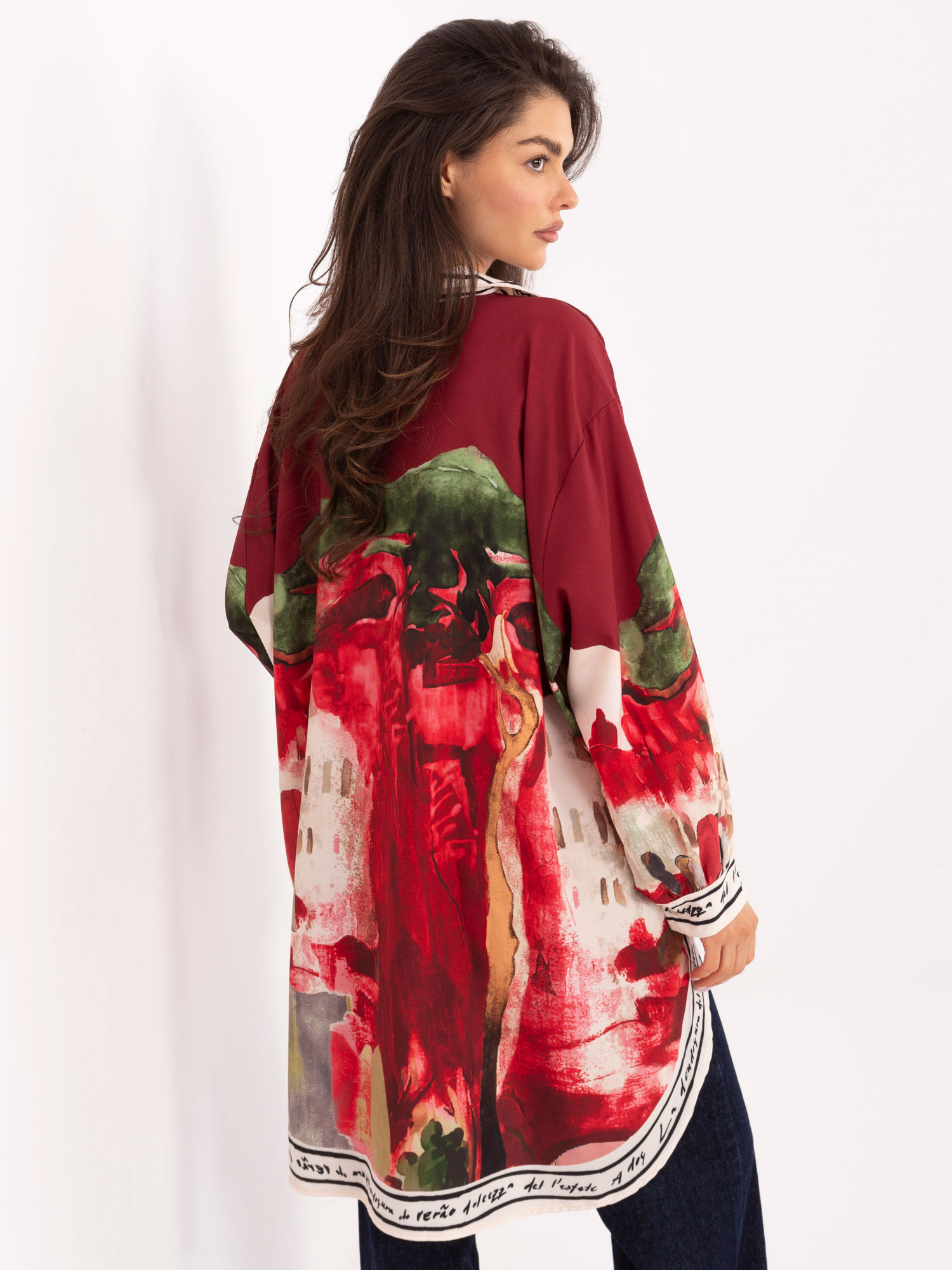 Wymiary koszuli w rozmiarze one size mierzone na płasko: szerokość pod pachami - 78 cm, długość rękawa - 55 cm (od szwu), szerokość w biodrach - 78 cm, długość całkowita - 78 cm (przód), długość całkowita - 101 cm (tył) .