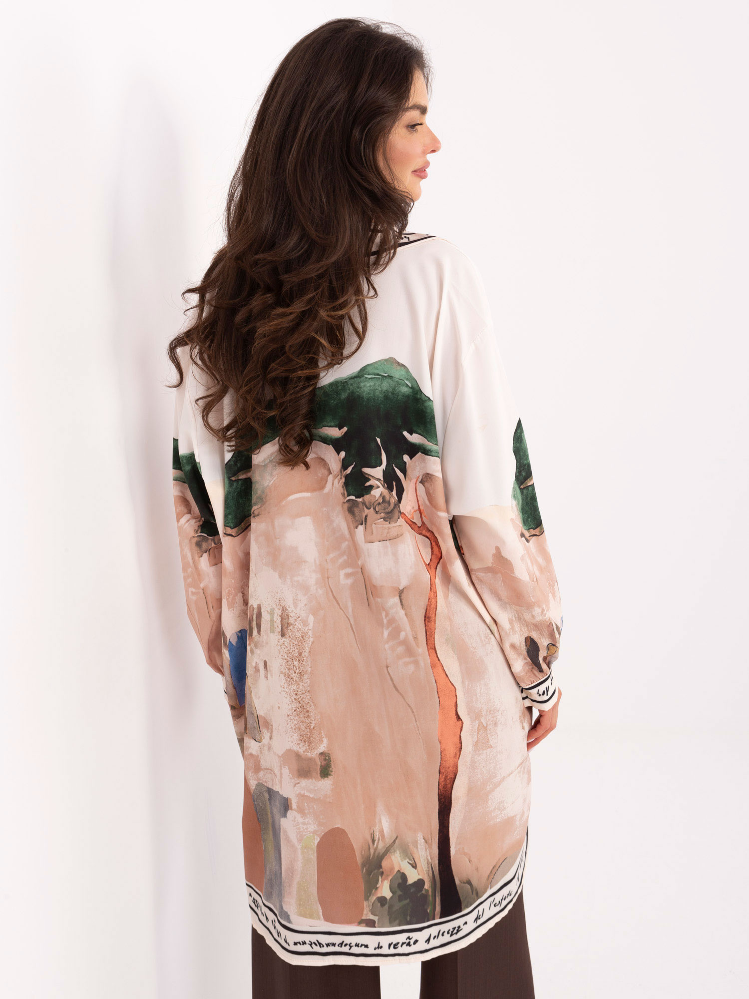Wymiary koszuli w rozmiarze one size mierzone na płasko: szerokość pod pachami - 78 cm, długość rękawa - 55 cm (od szwu), szerokość w biodrach - 78 cm, długość całkowita - 78 cm (przód), długość całkowita - 101 cm (tył) .