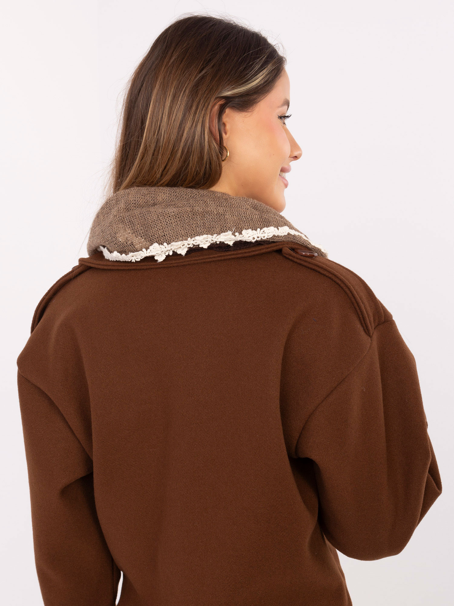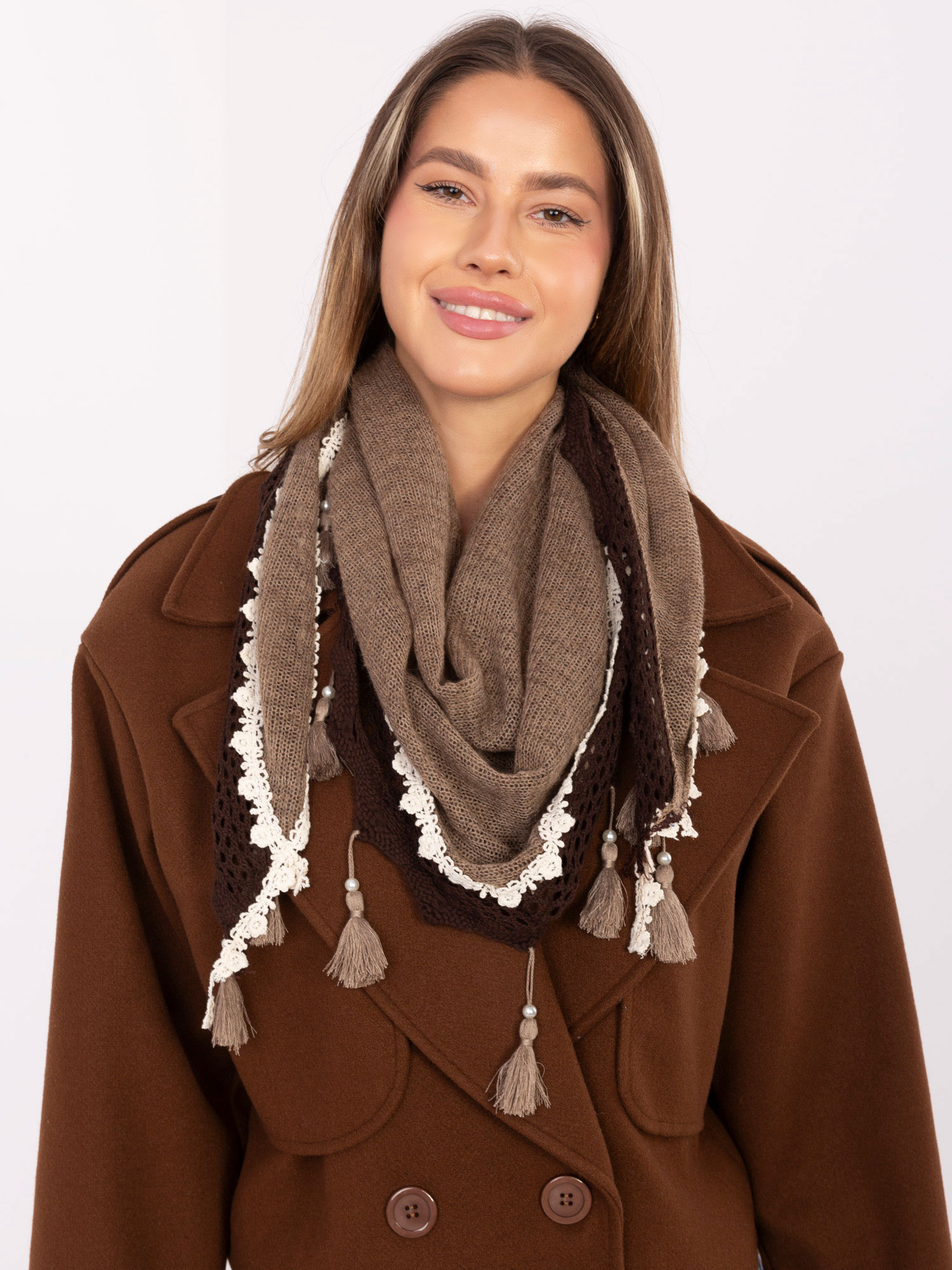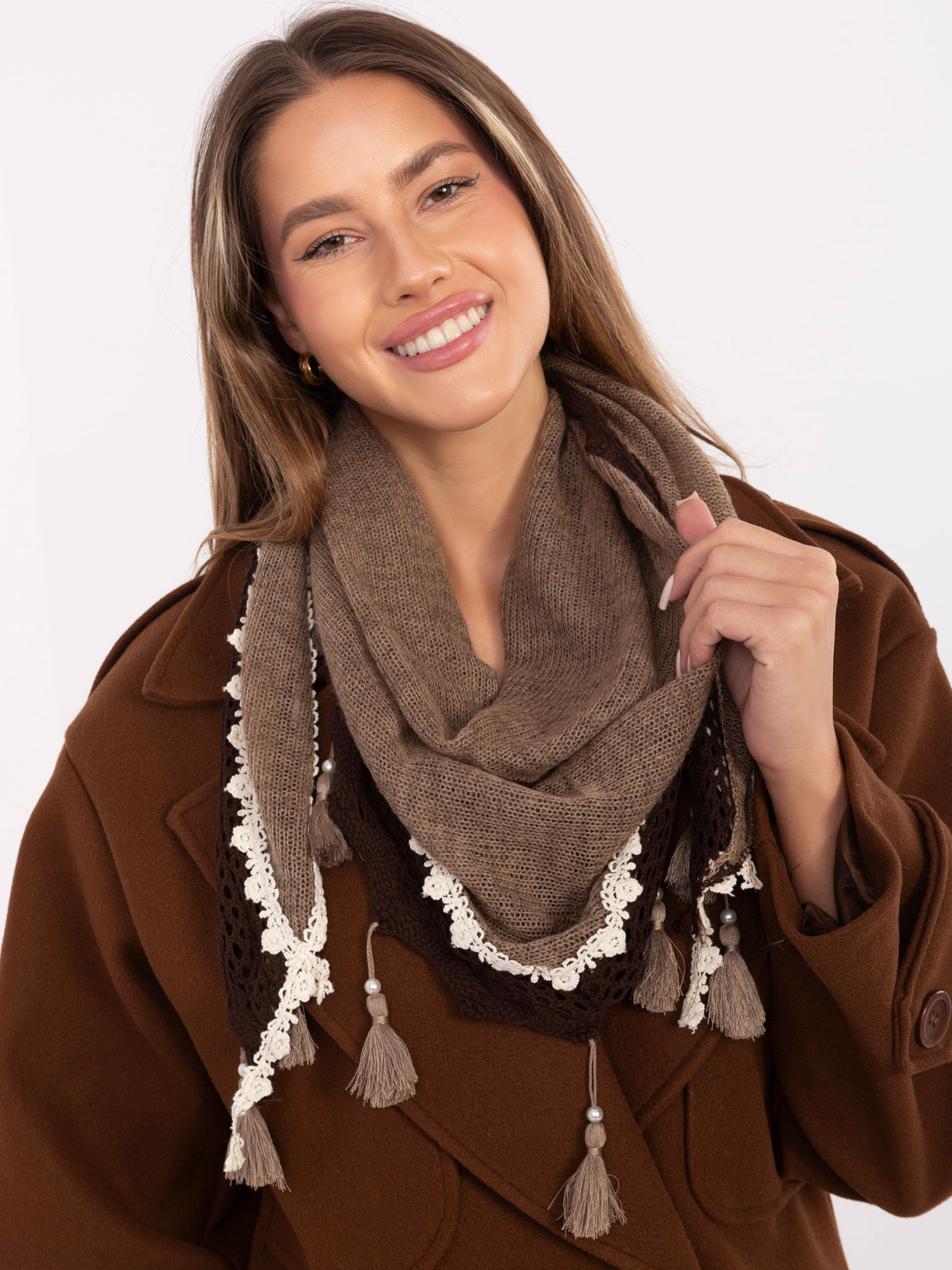Brązowa trójkątna chusta z frędzlami .