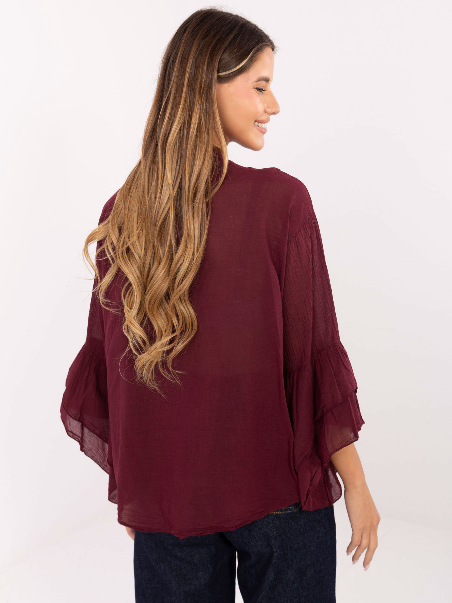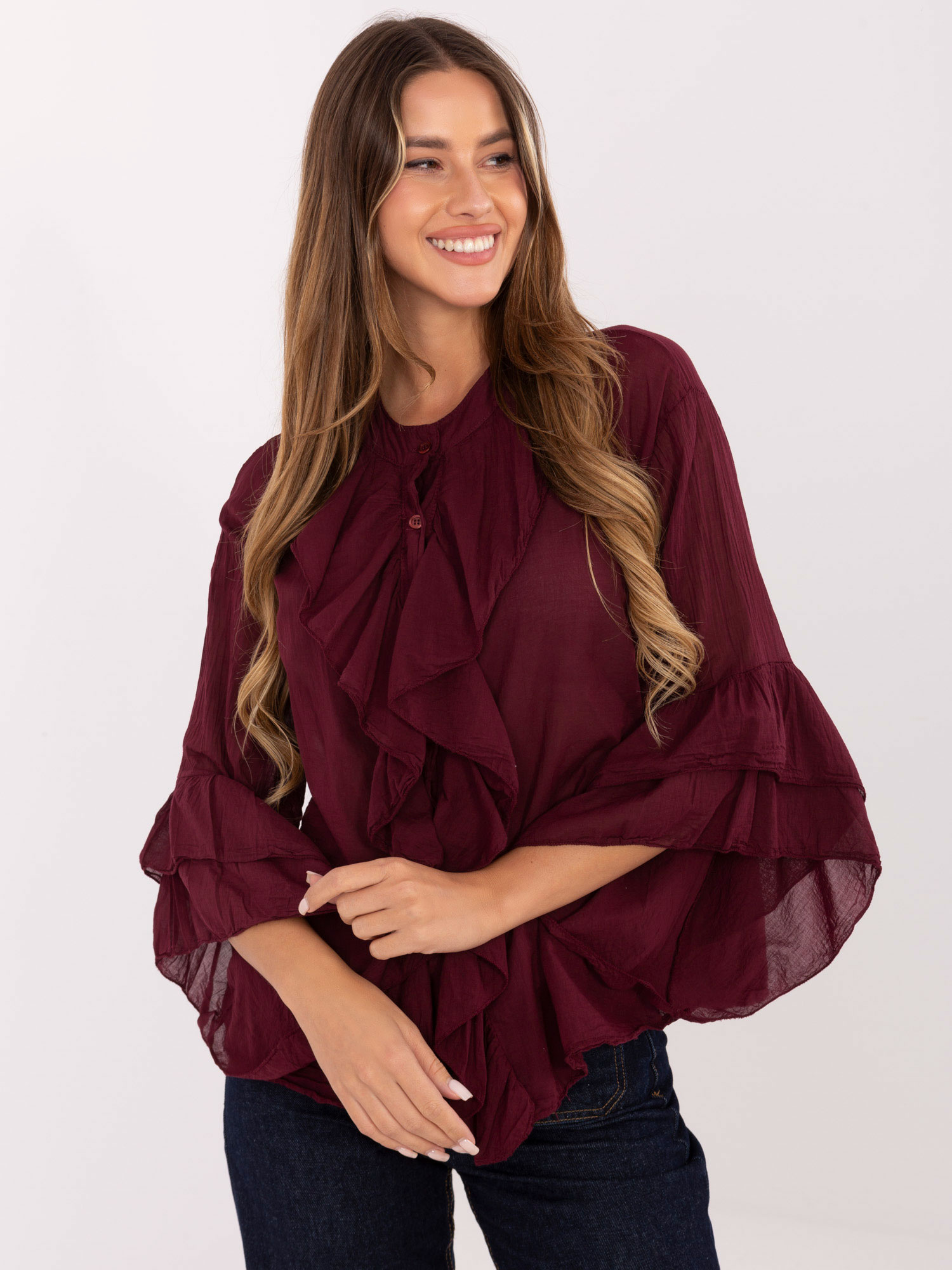 Burgundowa rozpinana koszula z żabotem .