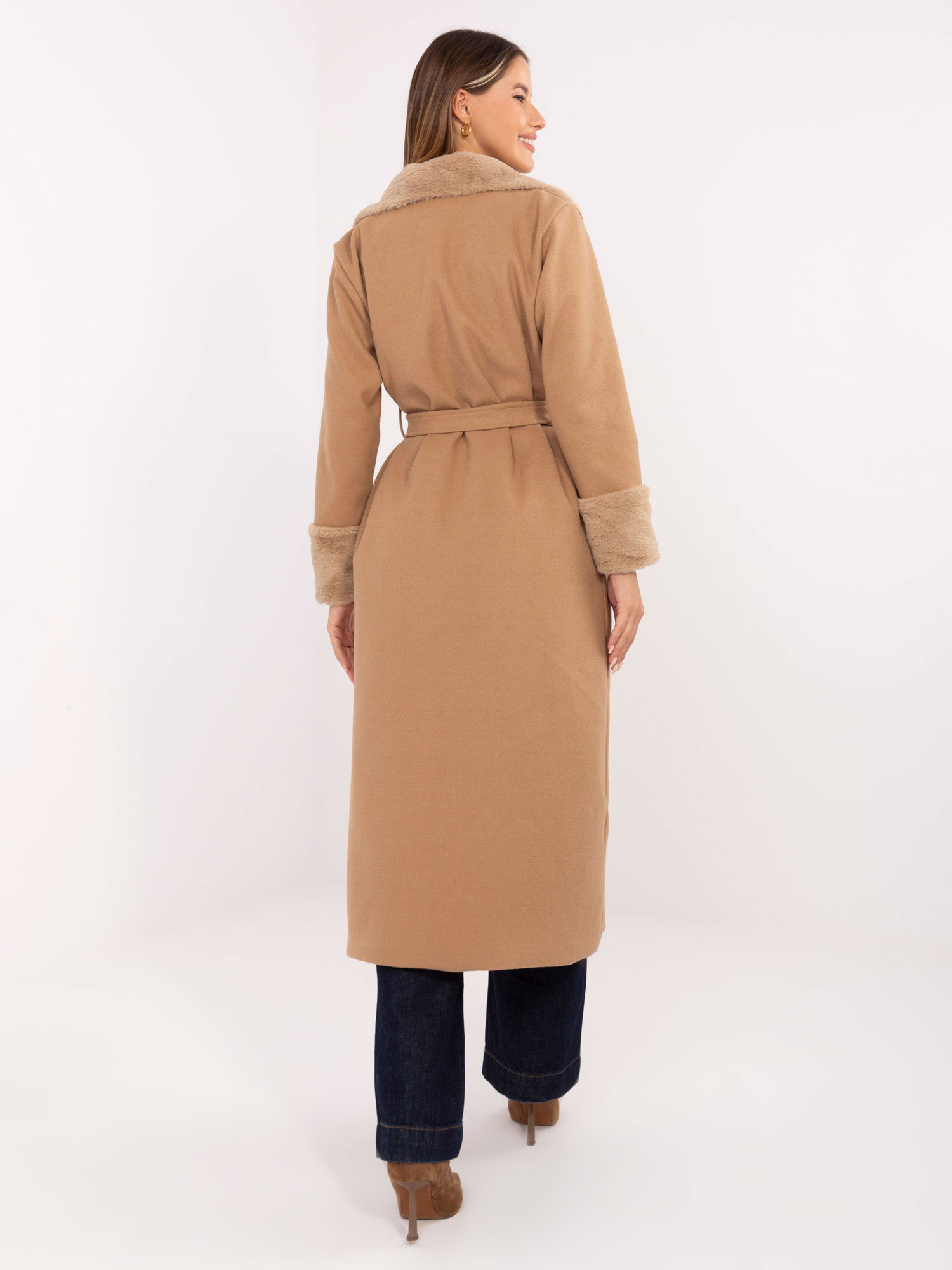 Camelowy długi płaszcz zimowy z paskiem RUE PARIS .