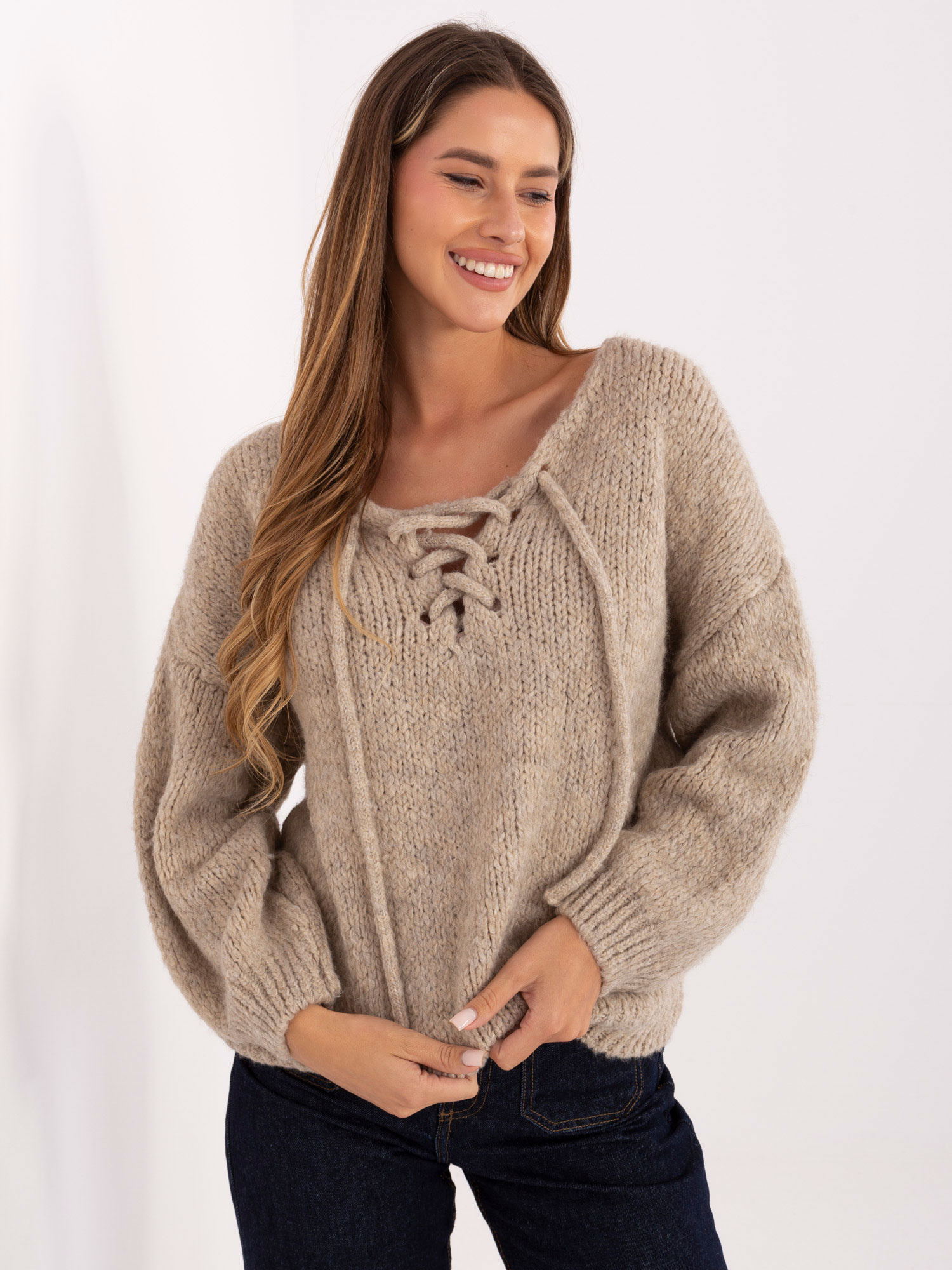 Beżowy damski sweter z gorsetowym wiązaniem .