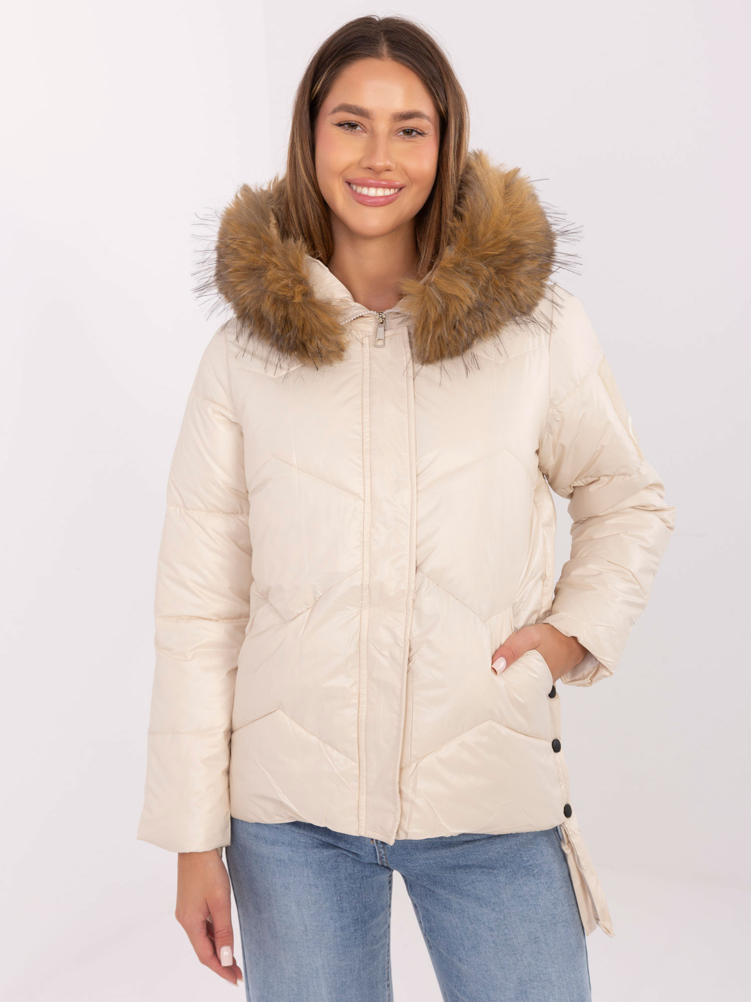 Jasnobeżowa puchowa kurtka z pikowaniem .