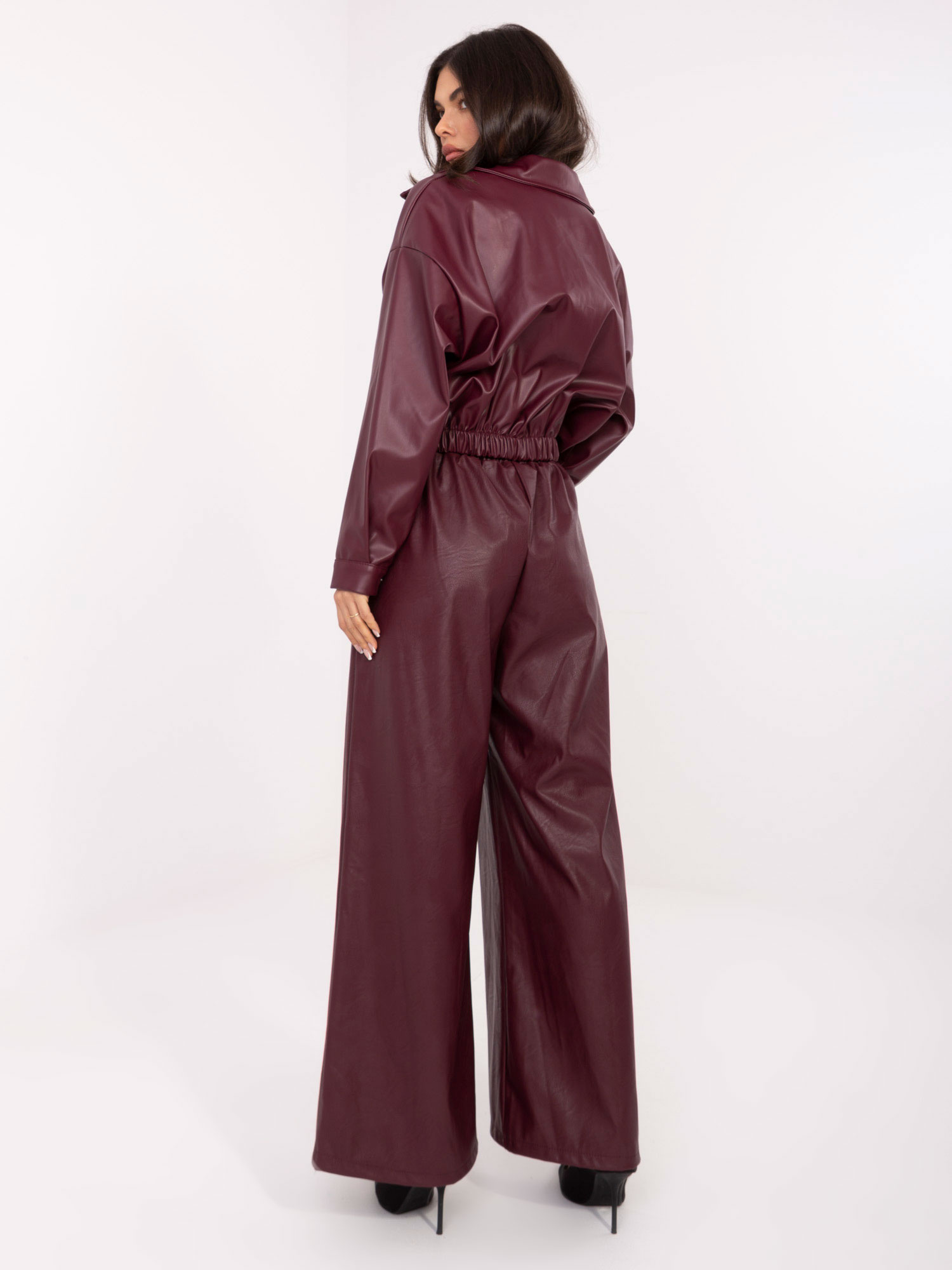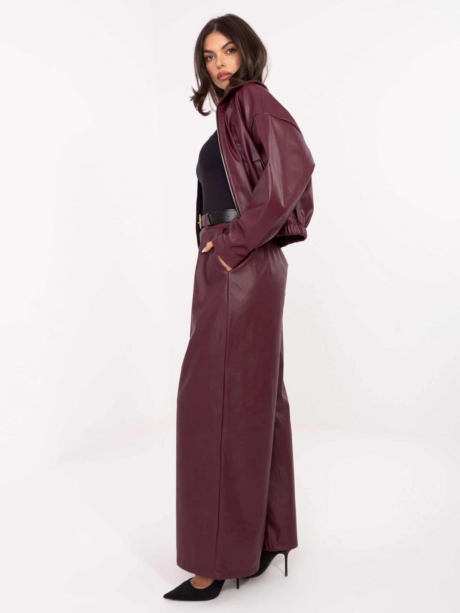 Burgundowe skórzane spodnie z paskiem RUE PARIS .