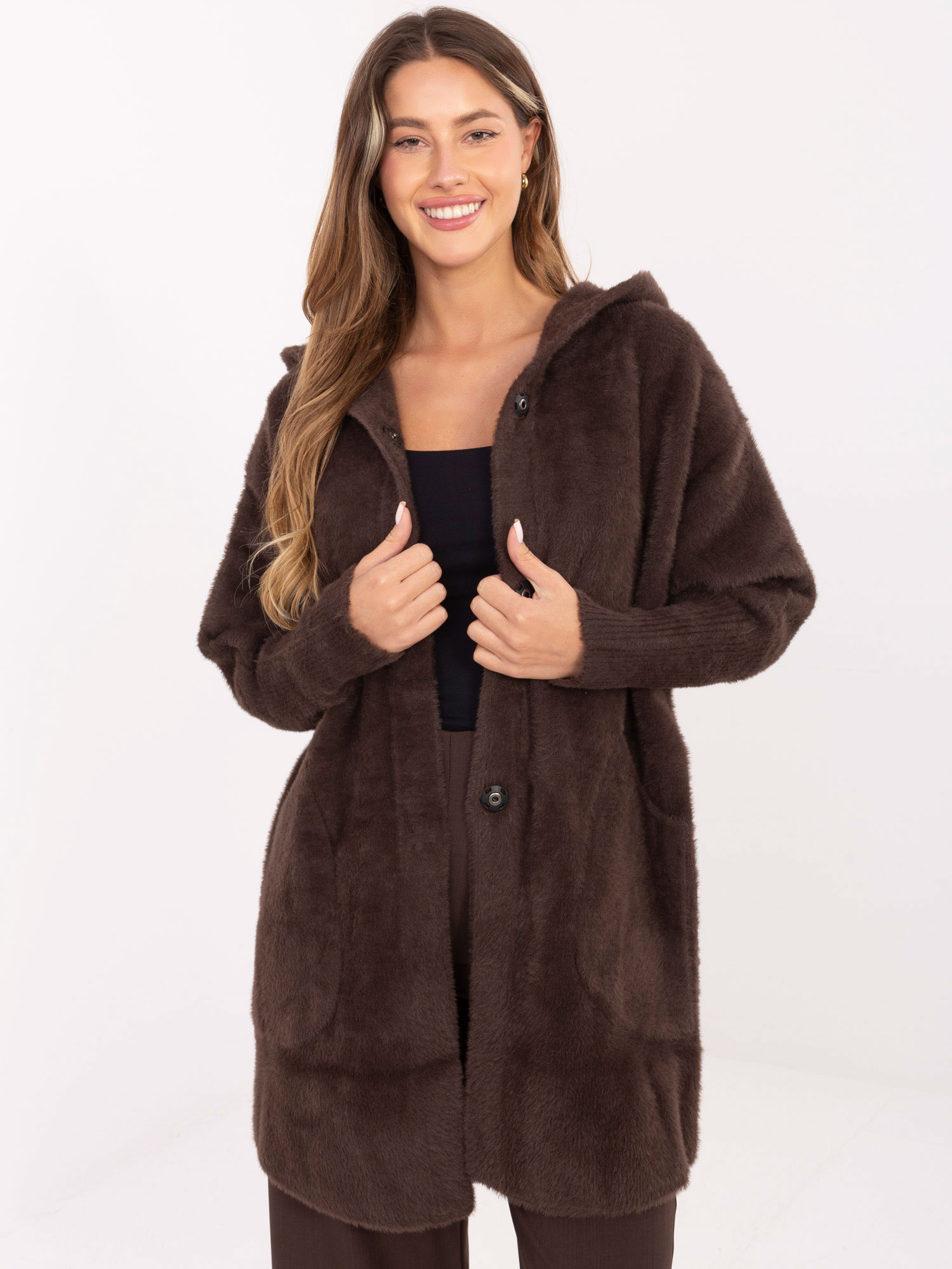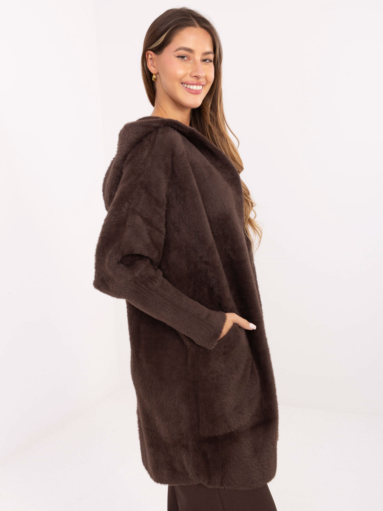 Czekoladowy damski płaszcz alpaka z kapturem .