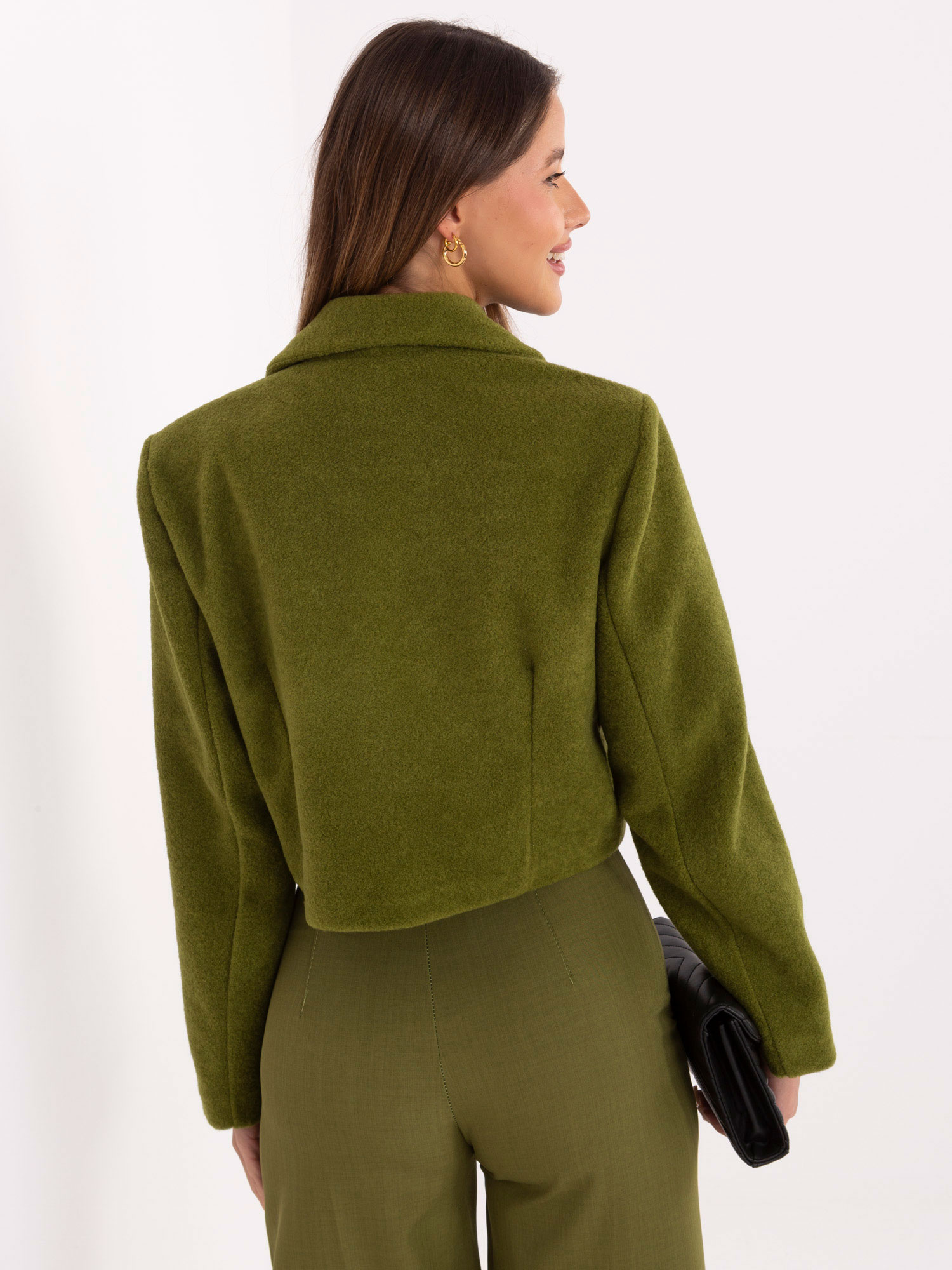 Oliwkowy dwurzędowy płaszcz damski RUE PARIS .