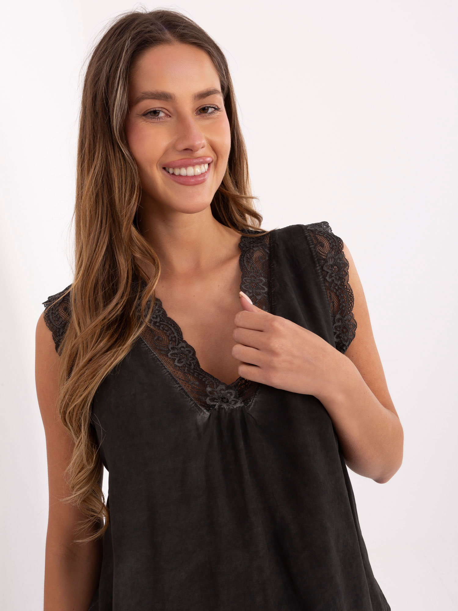 Wymiary topu w rozmiarze one size mierzone na płasko: szerokość pod pachami - 53 cm, długość całkowita - 65 cm, szerokość w biodrach - 60 cm.