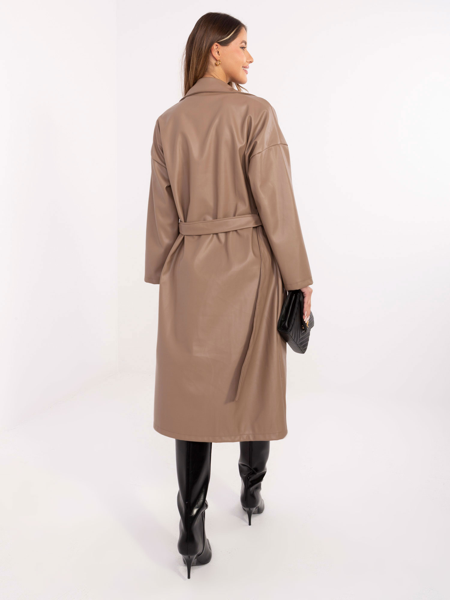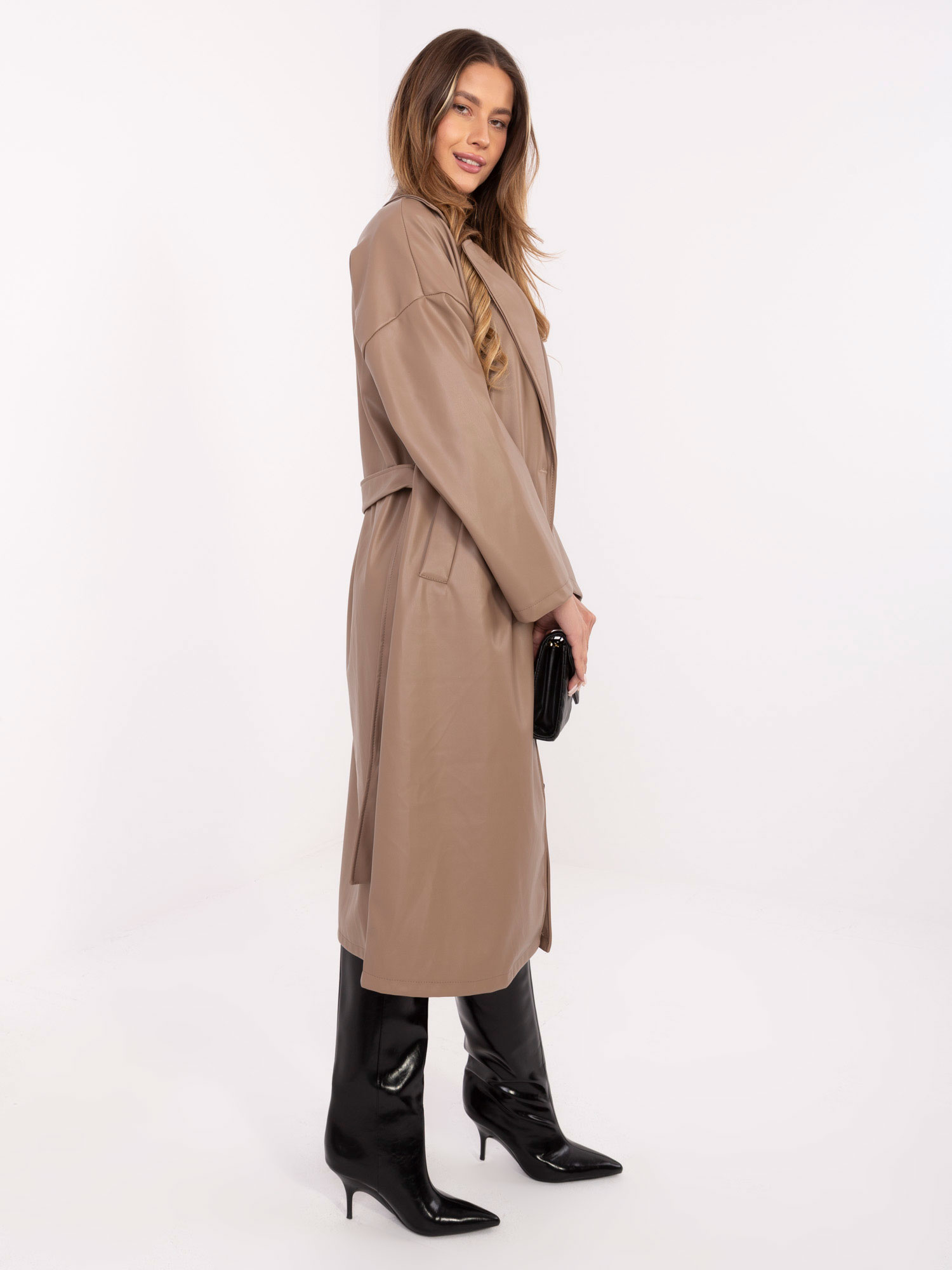 Opinie o Ciemnobeżowy skórzany płaszcz z paskiem RUE PARIS