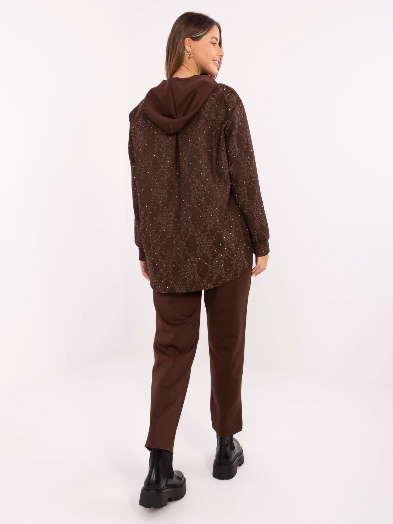Wymiary kompletu w rozmiarze one size: szerokość pod pachami - 61 cm, długość bluzy - 71 cm (przód), długość bluzy - 79 cm (tył), długość rękawa - 59 cm (od szwu), szerokość w biodrach - 64 cm, szerokość spodni w pasie - 34 cm (na płasko), szerokość spodni w pasie - 68 cm (po rozciągnięciu), szerokość w biodrach - 54 cm, długość spodni - 98 cm.