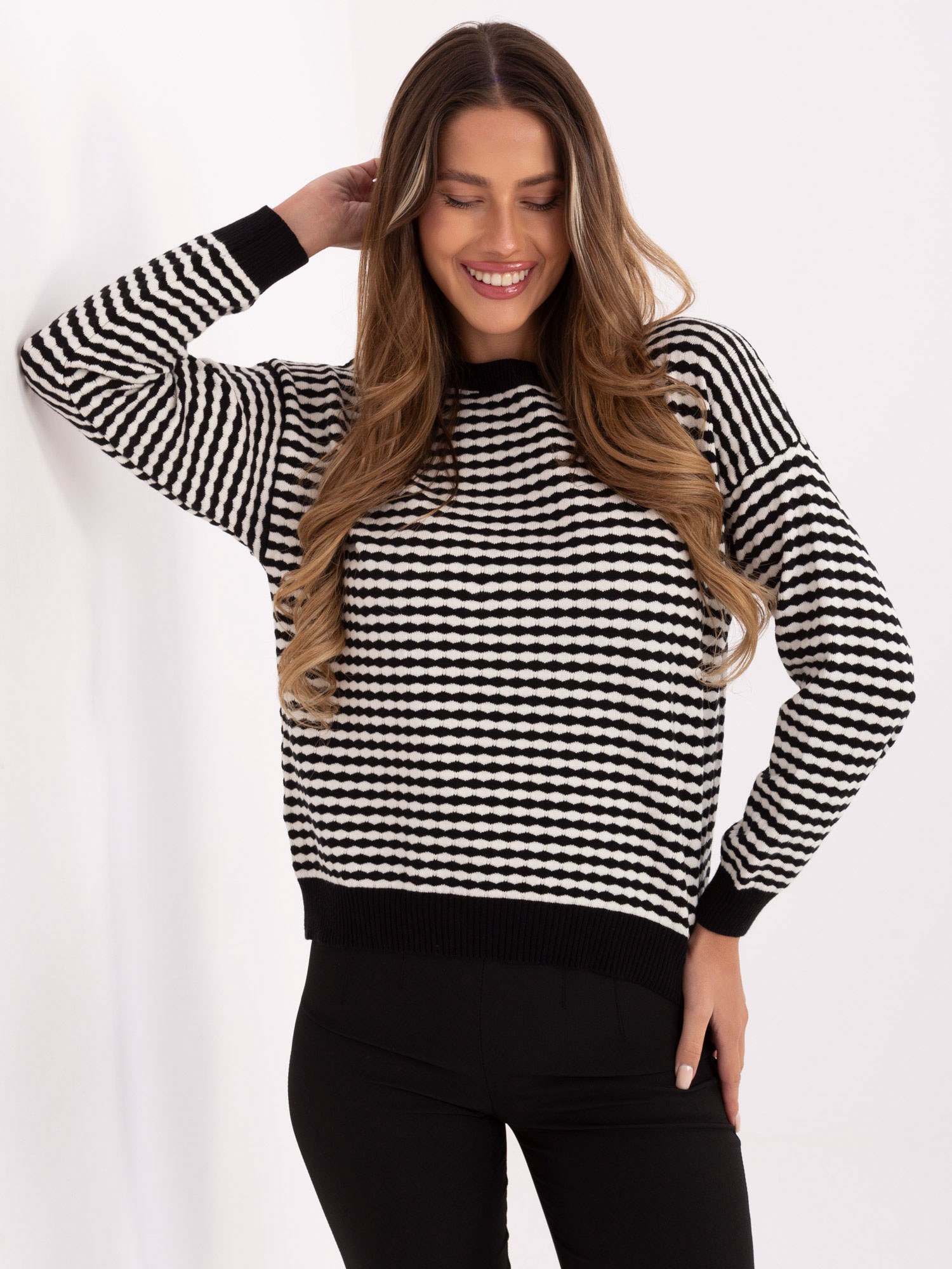 Wymiary swetra w rozmiarze one size mierzone na płasko: szerokość pod pachami - 54 cm, długość całkowita - 58 cm, szerokość w biodrach - 46 cm, długość rękawa - 46 cm.