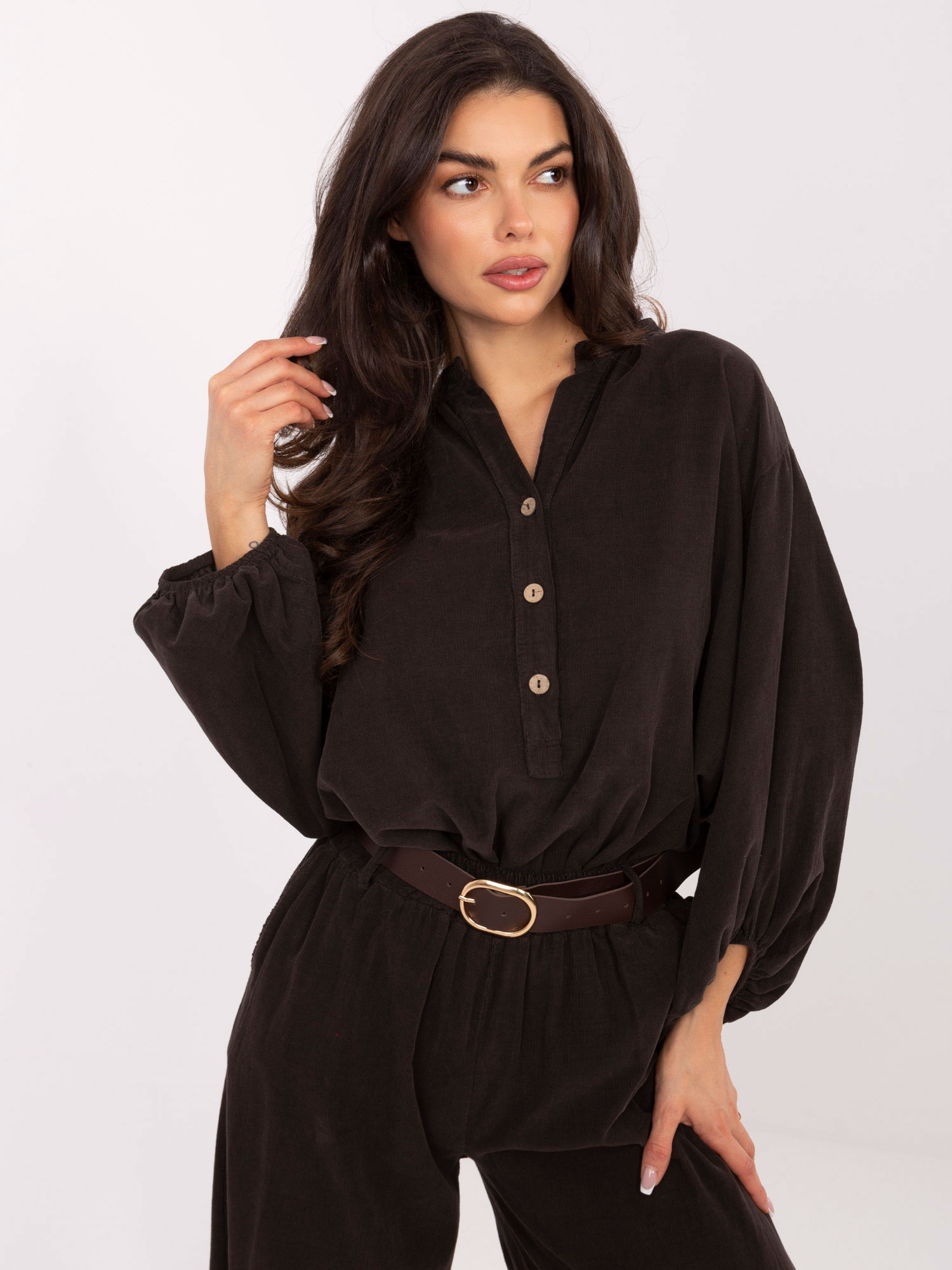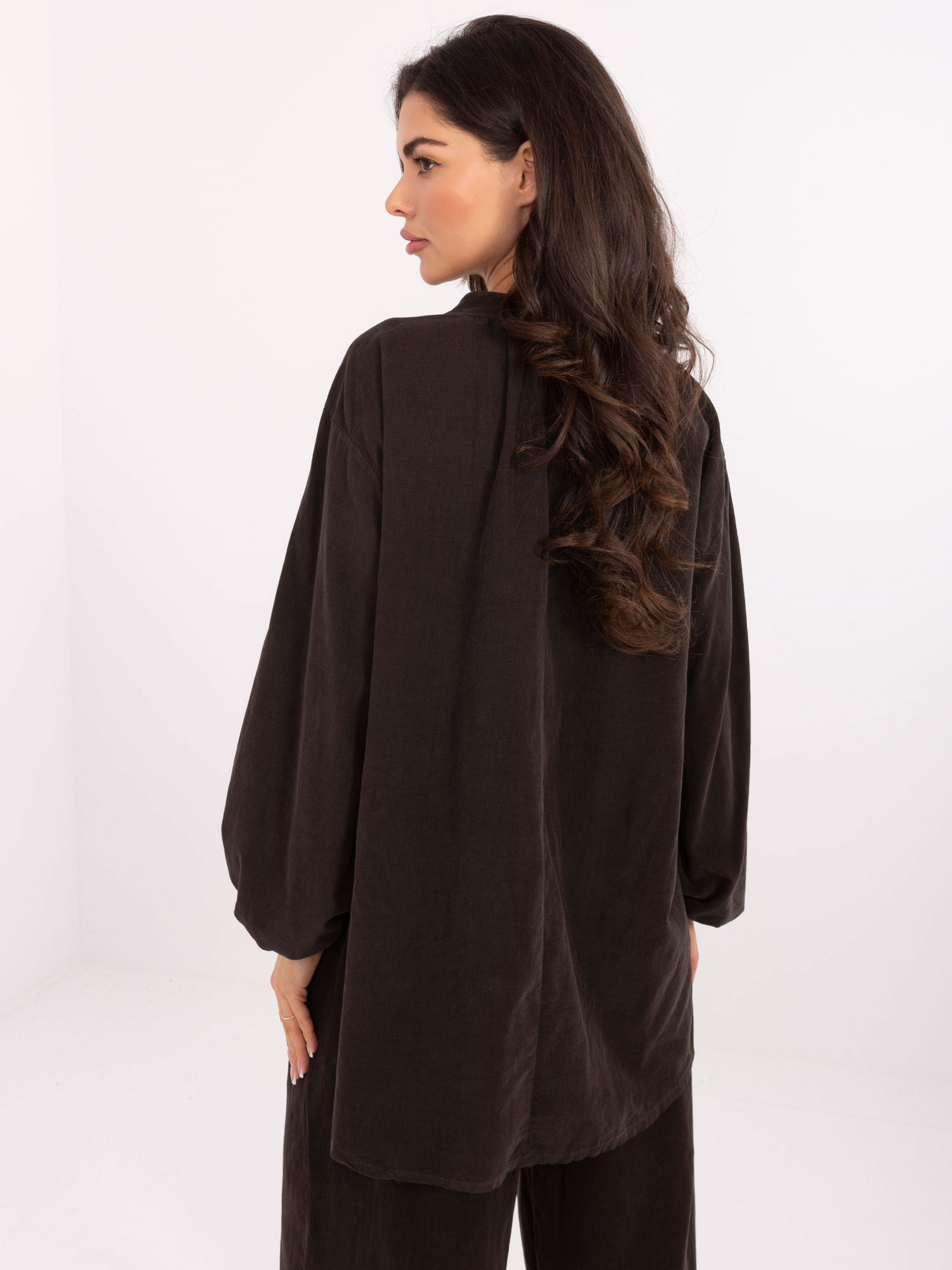 Wymiary bluzki w rozmiarze one size mierzone na płasko: szerokość pod pachami - 66 cm, długość całkowita - 66 cm (przód), długość całkowita - 77 cm (tył), szerokość na dole - 76 cm, długość rękawa - 51 cm (od szwu).