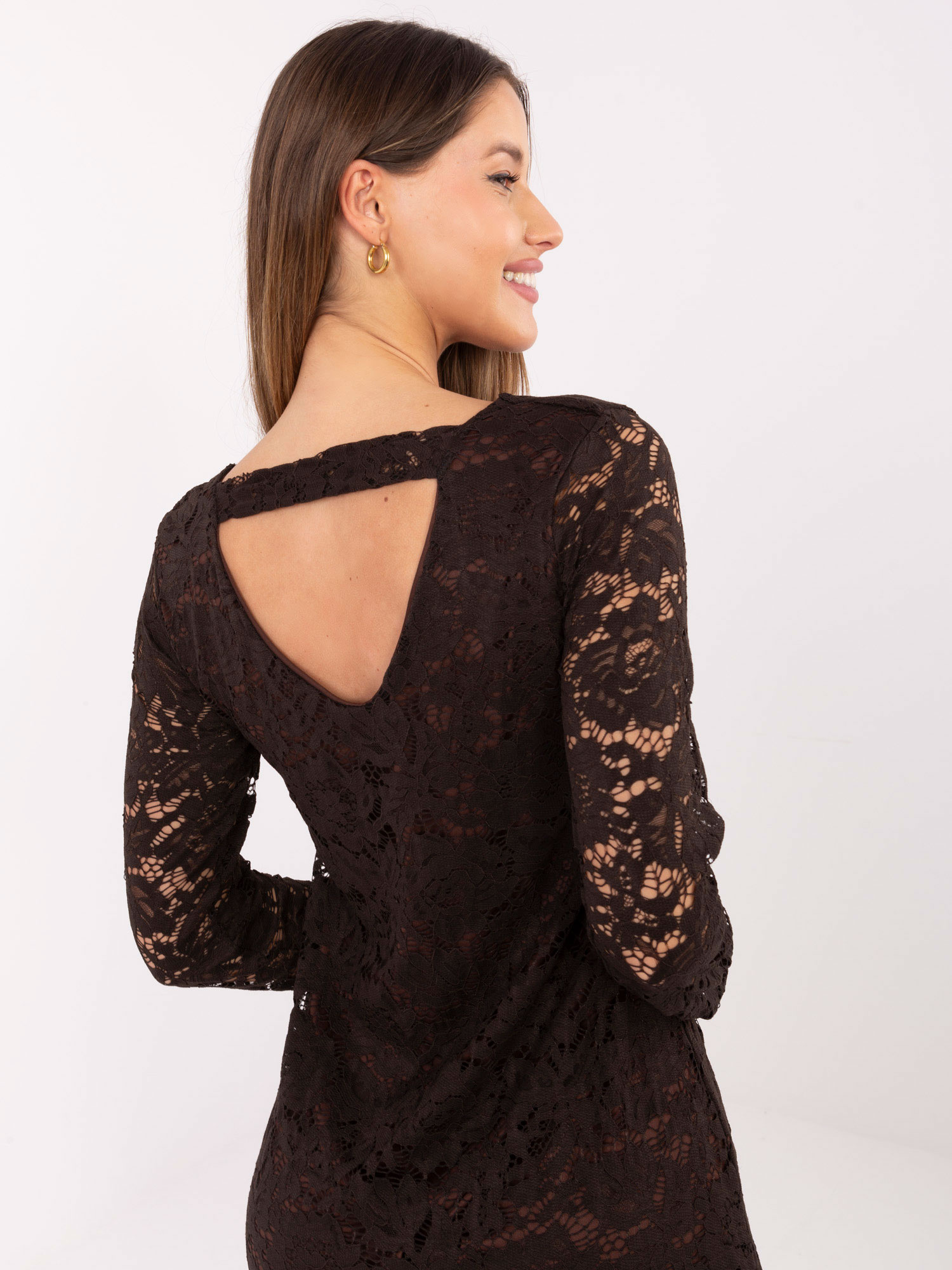 Brązowa koronkowa sukienka z dekoltem na plecach .