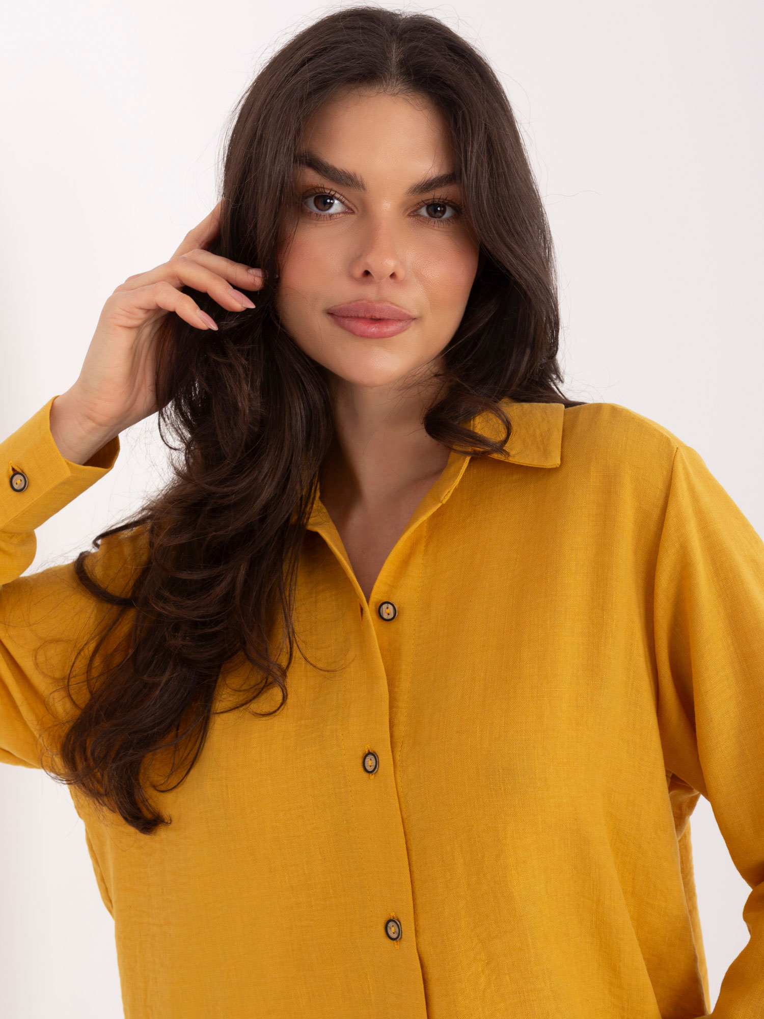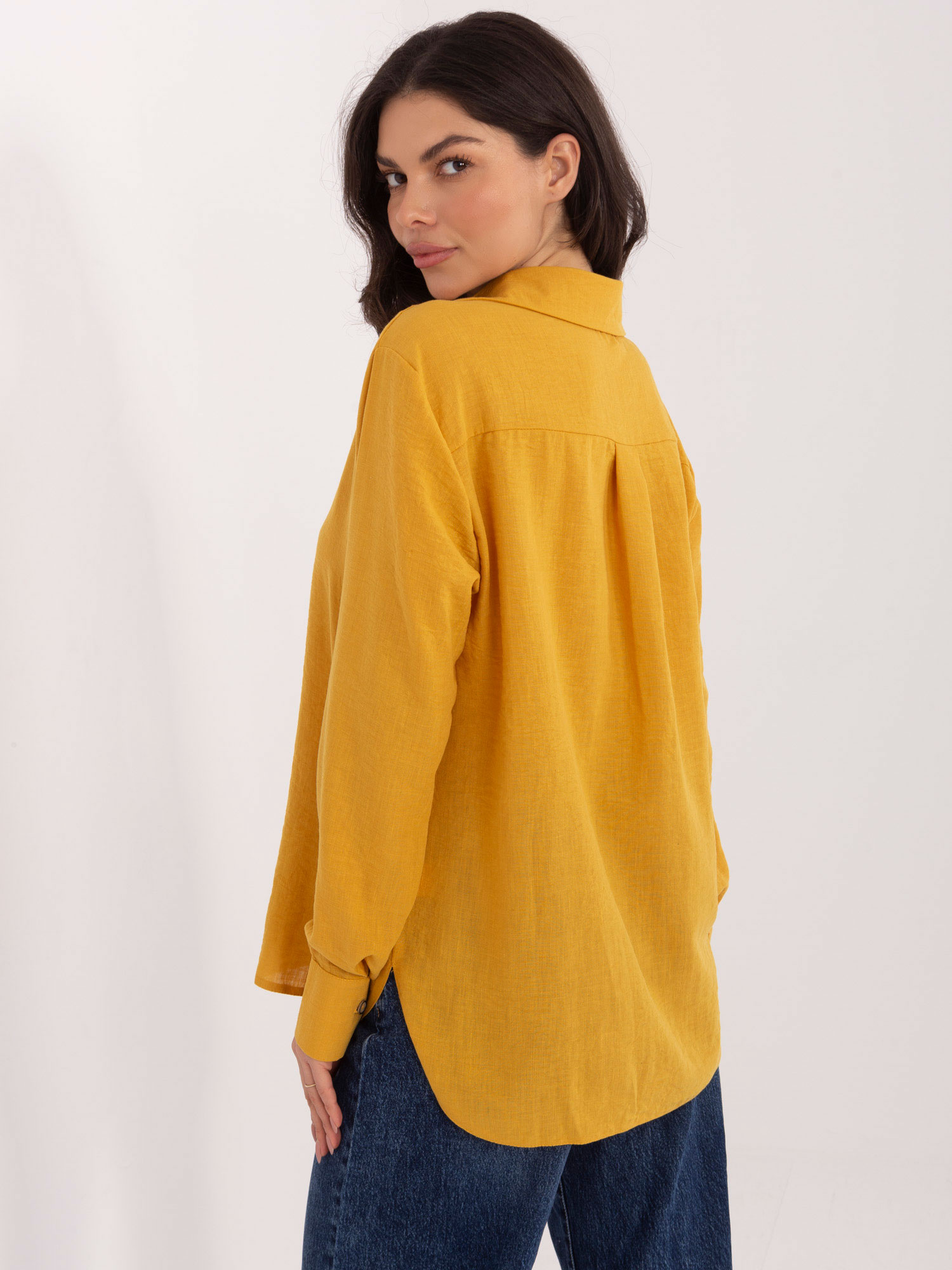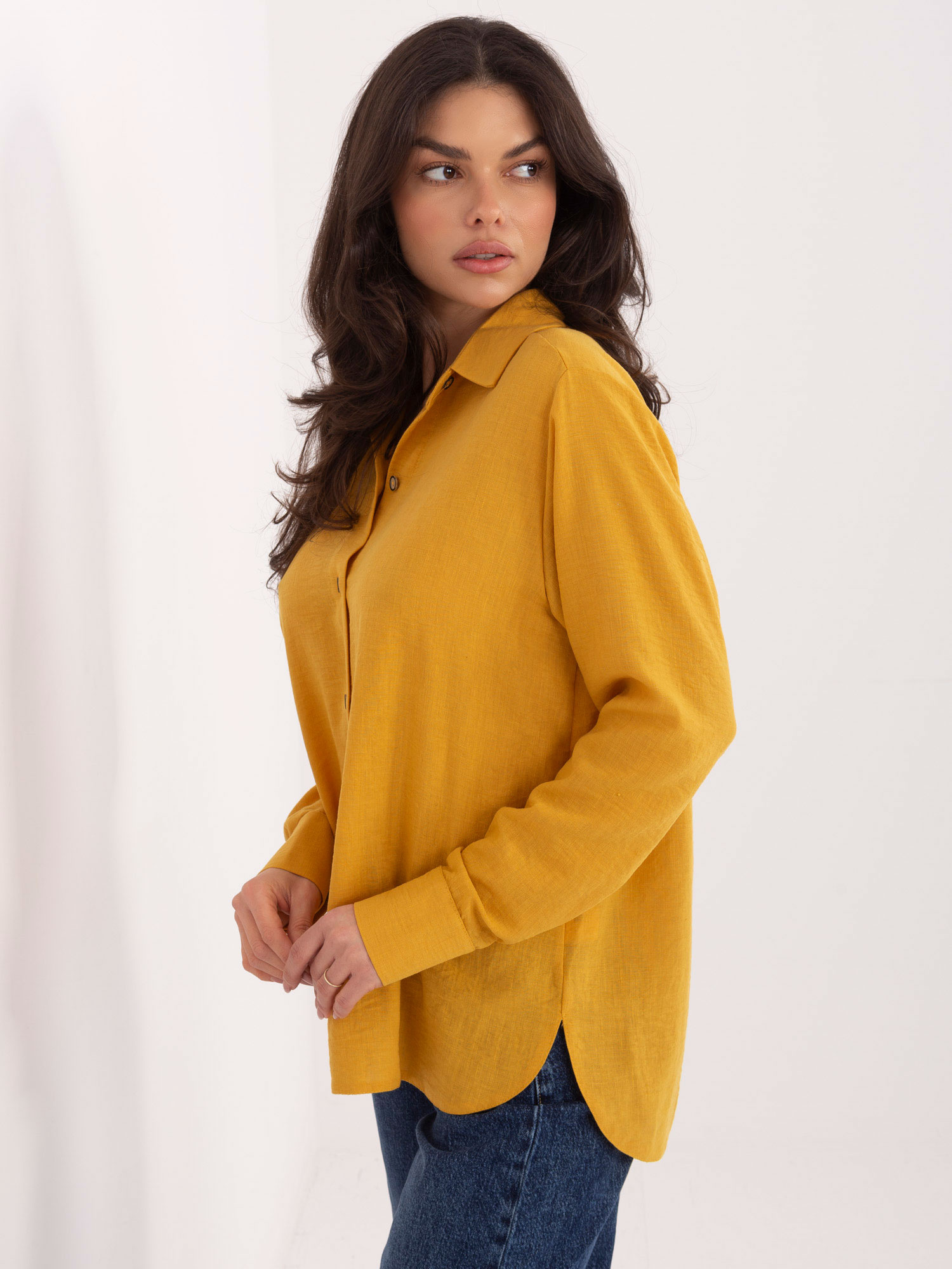 Ciemnożółta damska koszula z długim rękawem .