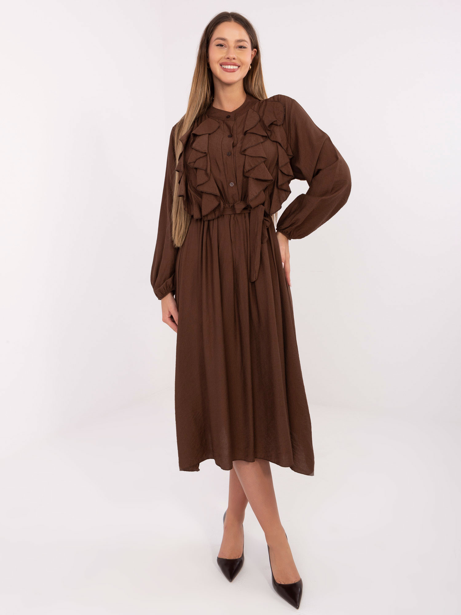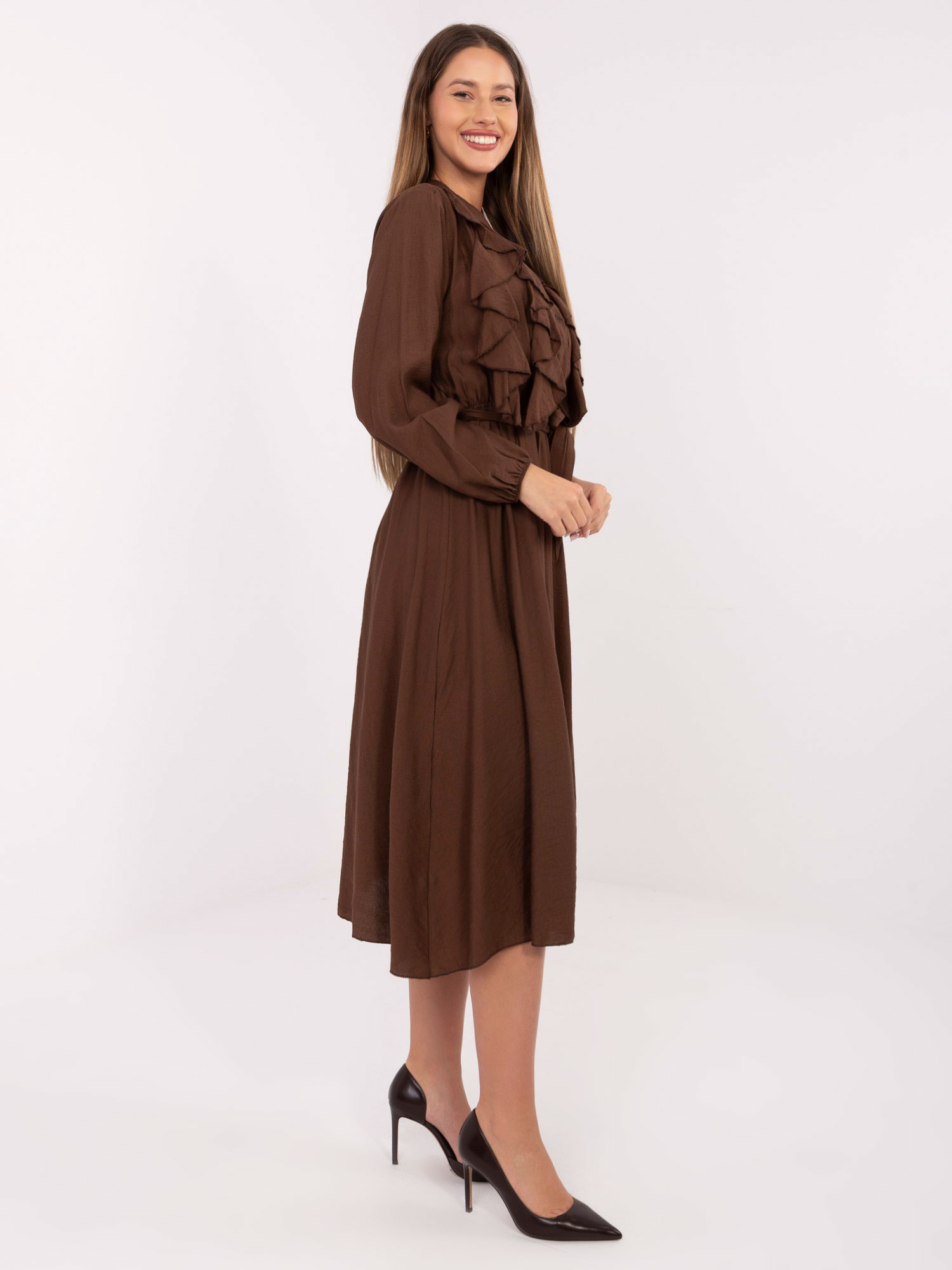 Brązowa elegancka sukienka z żabotem