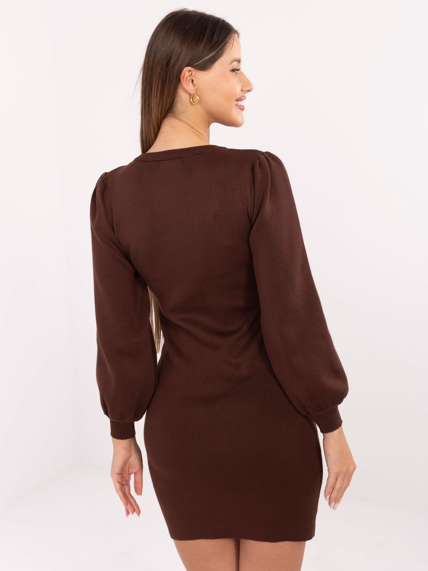 Brązowa dzianinowa sukienka z bufiastym rękawem .